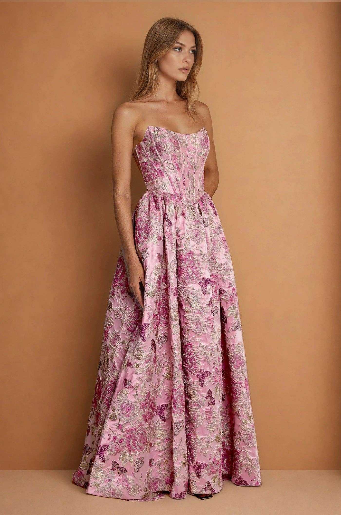 This corset pink ballgown is not just a dress; it’s a statement. Its architectural skirt provides movement and drama, ideal for twirling on the dance floor or making a grand entrance at any event. The meticulously designed bodice ensures a secure fit that makes it comfortable for extended wear, so you can enjoy every moment without worrying about adjustments.