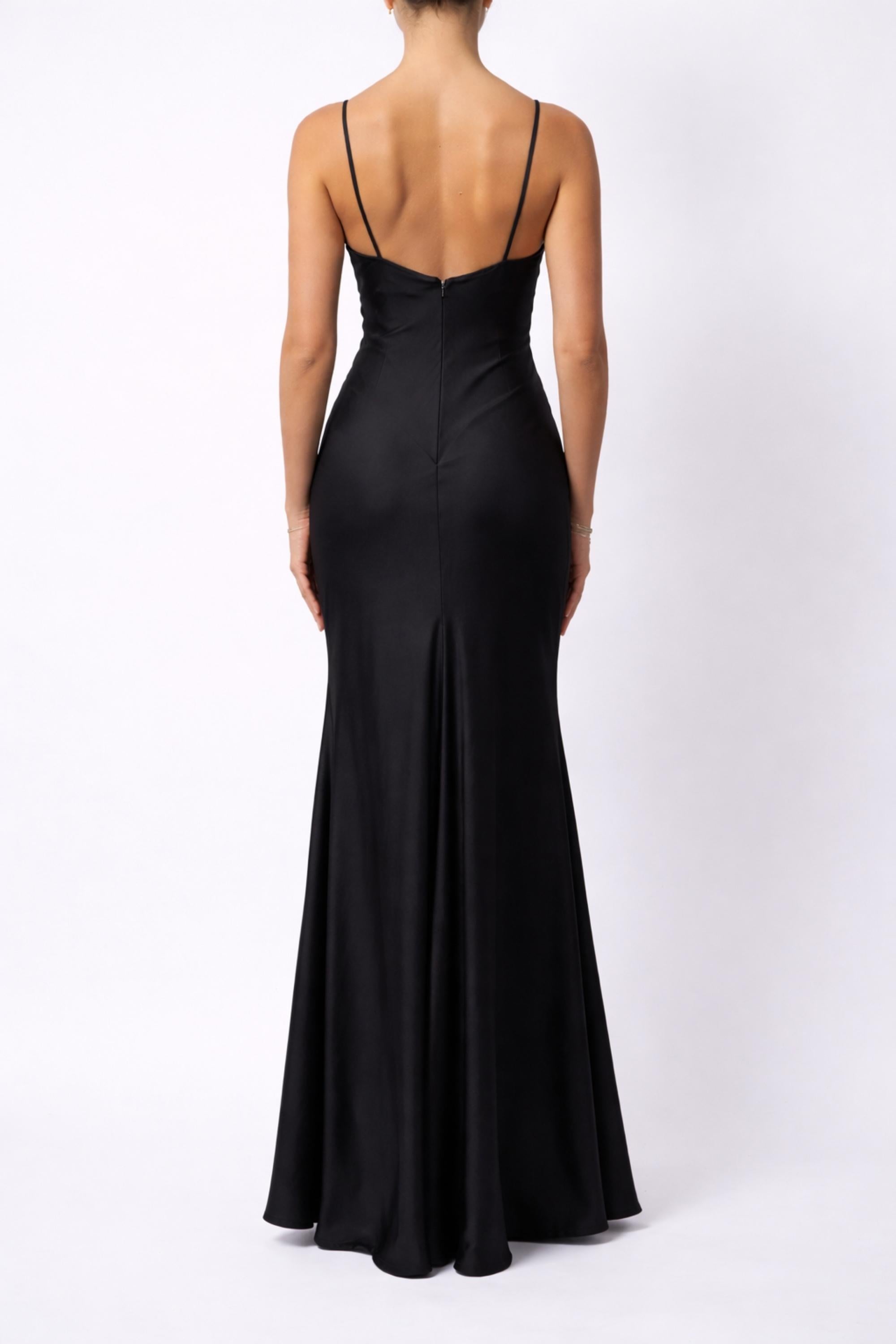 The delicate embellished detailing across the bodice adds texture and understated sparkle, enhancing the feminine V neckline. Slim spaghetti straps provide light support while maintaining the clean slip-style design. The fitted shape flows into a full-length hem, creating a graceful line that elongates the figure. Perfect for evening & prom wear, the Black Satin Slip Embellished Long Gown delivers a luxury feel without the luxury price, making it one of our beautiful affordable gowns for special occasions.