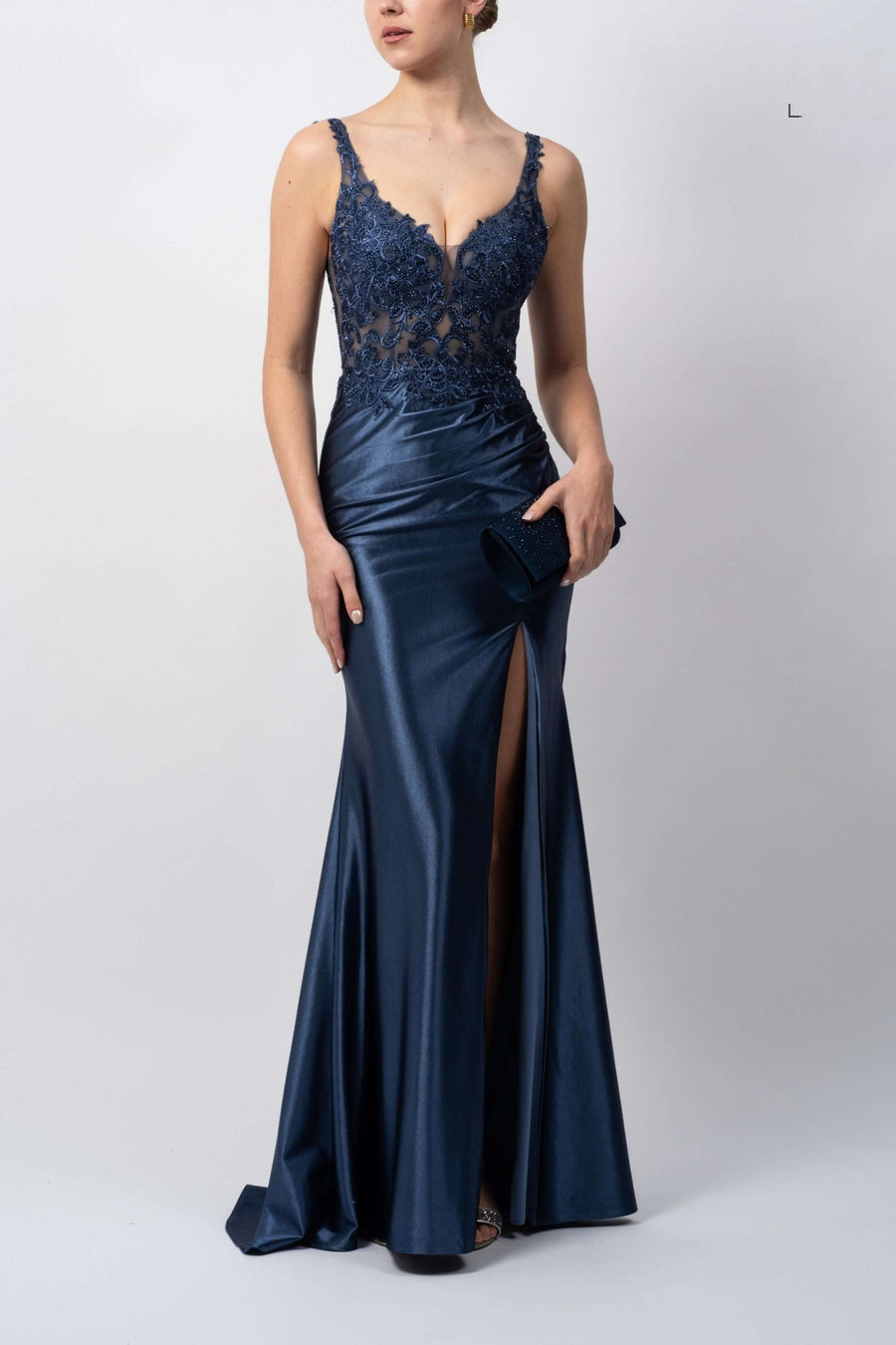 The Mascara Airforce Blue Jersey Dress MC114411 is a stunning choice for prom nights and elegant evening occasions. Designed in a soft airforce blue tone, this gown features a beautifully embroidered lace bodice with sheer detailing that adds a romantic and feminine feel. The delicate straps and flattering plunge neckline enhance the silhouette while keeping the look refined and graceful.