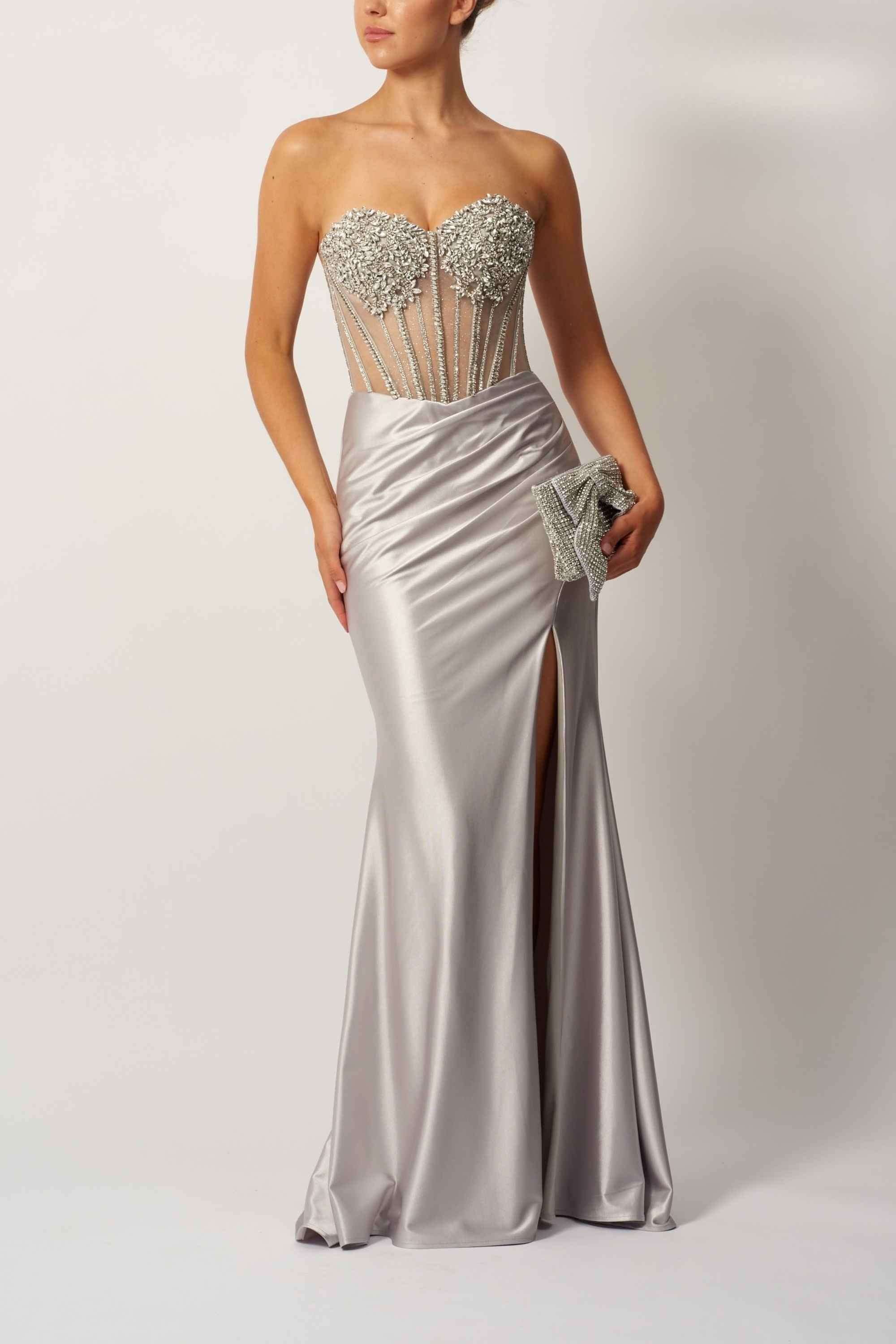 This refined gown from Mascara London is a beautiful choice for formal evenings and special occasions. The Silver Bow Jersey Dress combines a structured bodice with soft draping to create a flattering and confident silhouette. The fitted corset-style top features detailed beadwork and a subtle sweetheart shape that adds definition while remaining elegant and wearable.