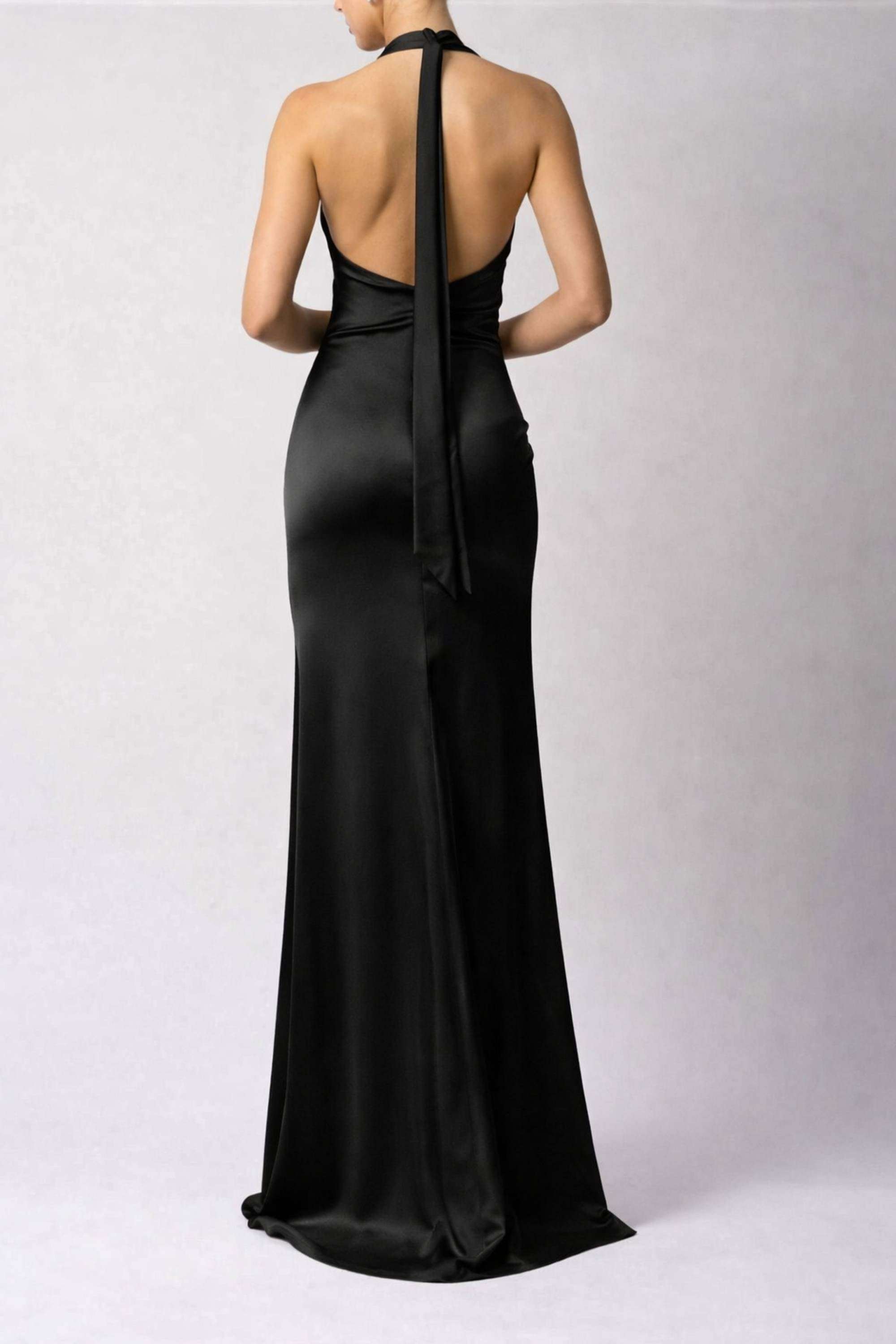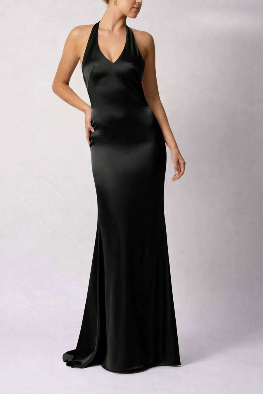 The fitted shape enhances the natural figure, while the halter neckline creates a clean, feminine line through the shoulders and neckline. A delicate tie-back detail adds interest from the rear while allowing for a secure and adjustable fit. The floor-length skirt flows effortlessly, making this Black Tie Back Satin Dress ideal for formal evenings, weddings, and special events where a timeless look is key.