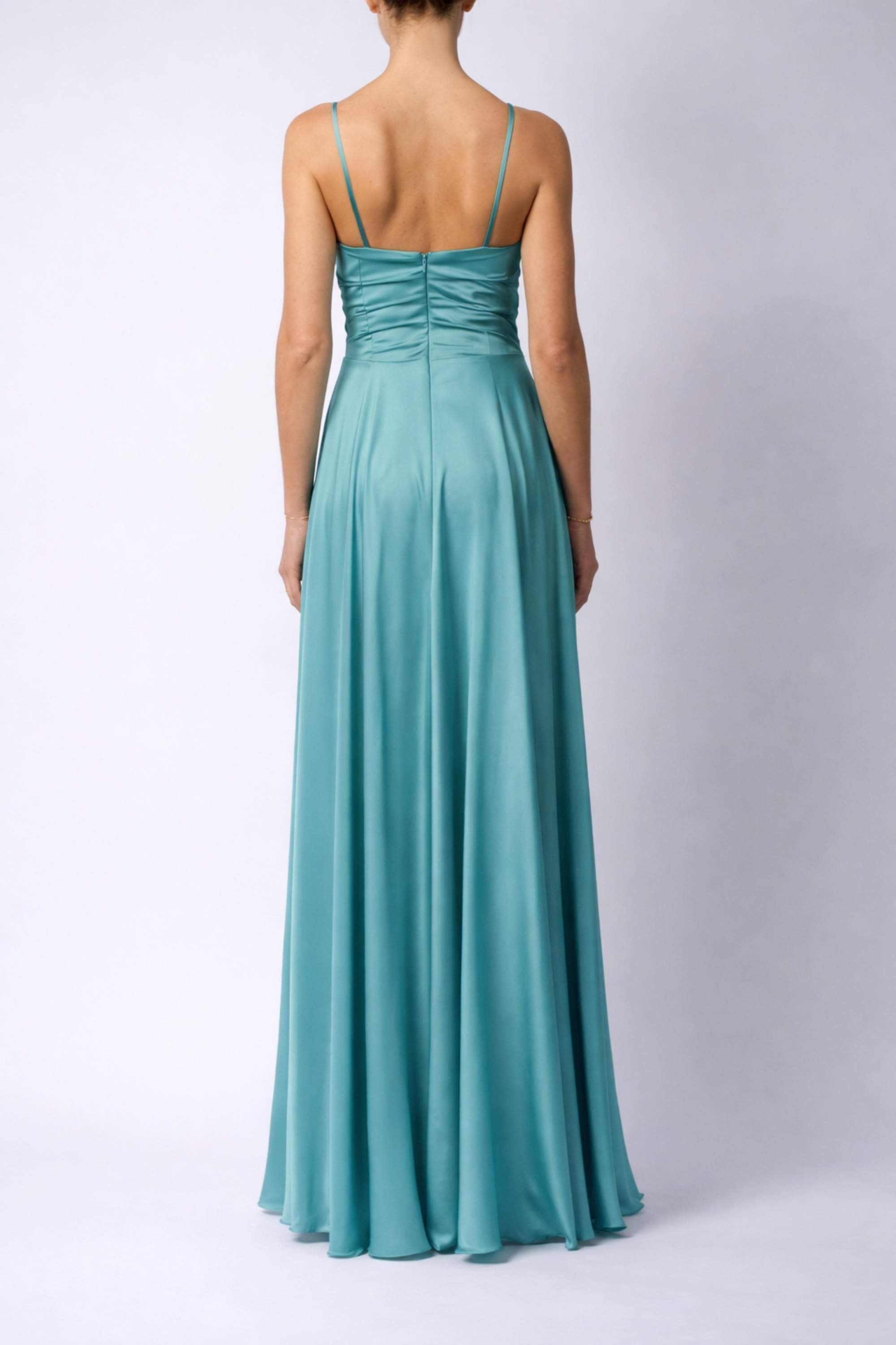 Slim spaghetti straps and a soft V neckline add a feminine touch, while the defined waistband creates a flattering silhouette. The full-length skirt flows effortlessly to the floor and is finished with a thigh-high split for ease of movement and a modern edge. Perfect for evening & prom wear, the Misty Green Satin Pleat Prom Dress delivers a luxury feel without the luxury price, making it one of our beautiful affordable gowns for special occasions.
