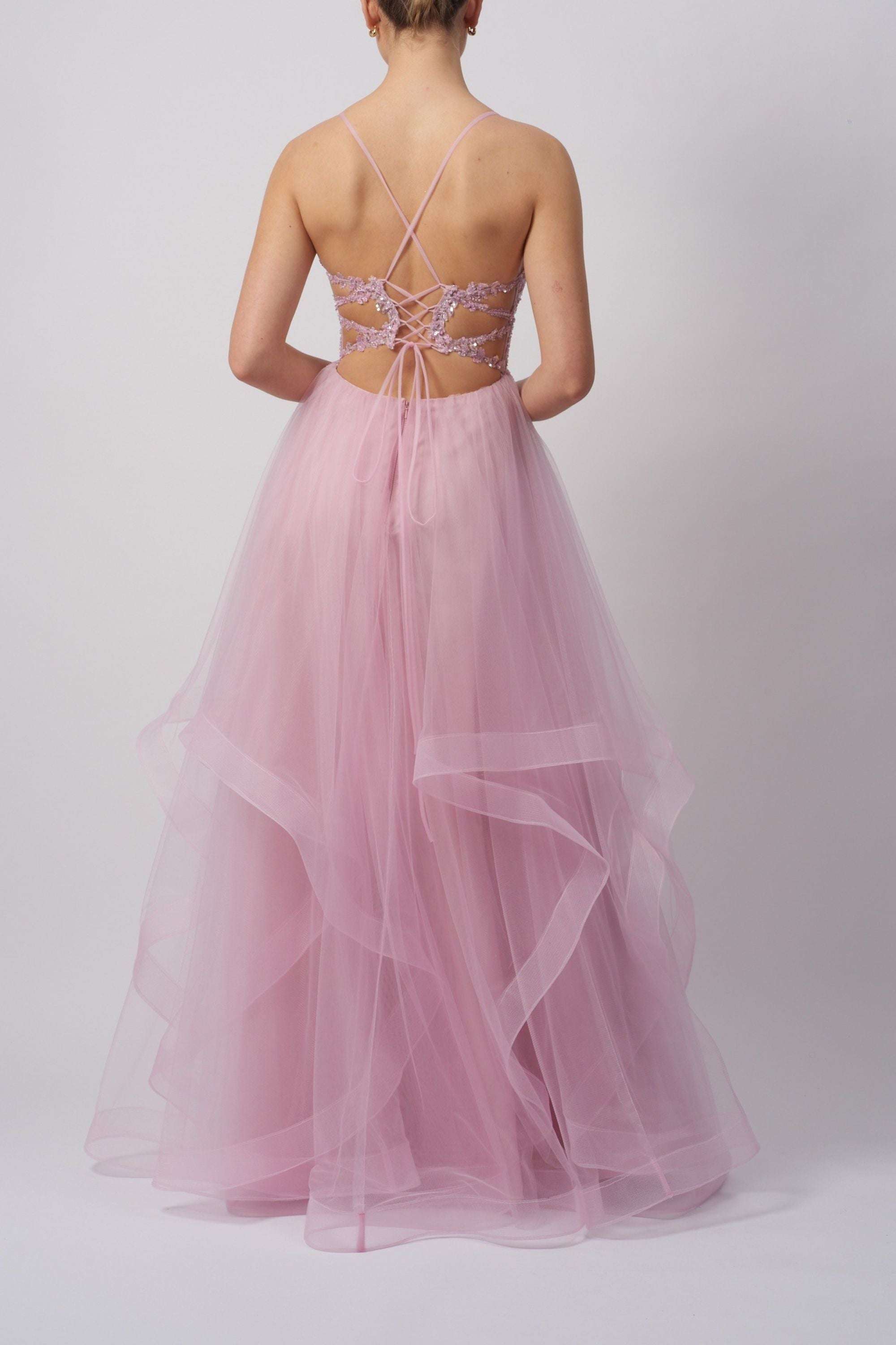 Pair this petrol blue tiered tulle dress with silver or crystal accessories and soft heels to highlight the embroidered corset and let the flowing tulle layers take centre stage effortlessly.