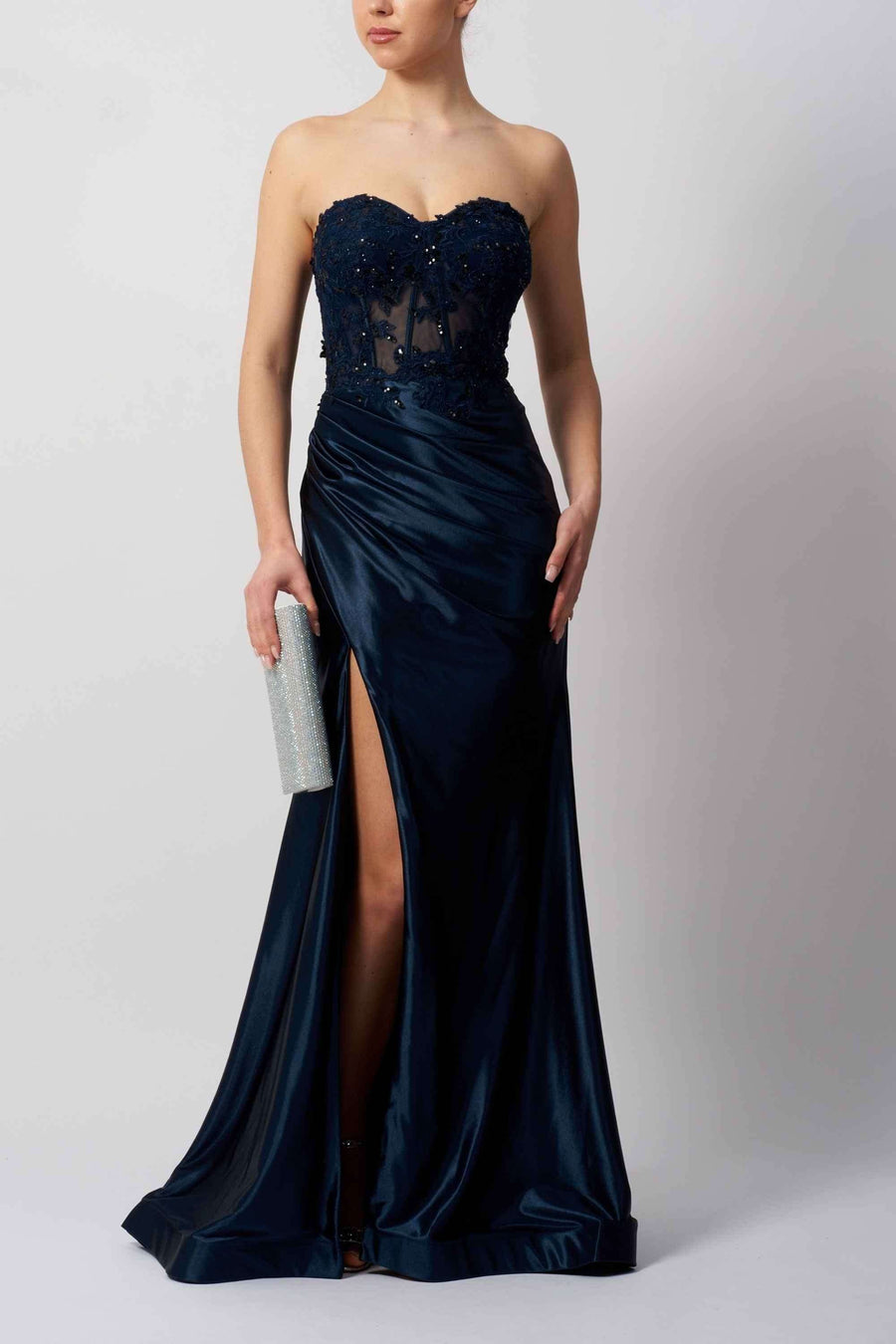 Pair this ink blue prom dress with silver or crystal accessories and sleek heels to elevate the embellishment and complete a polished evening look.