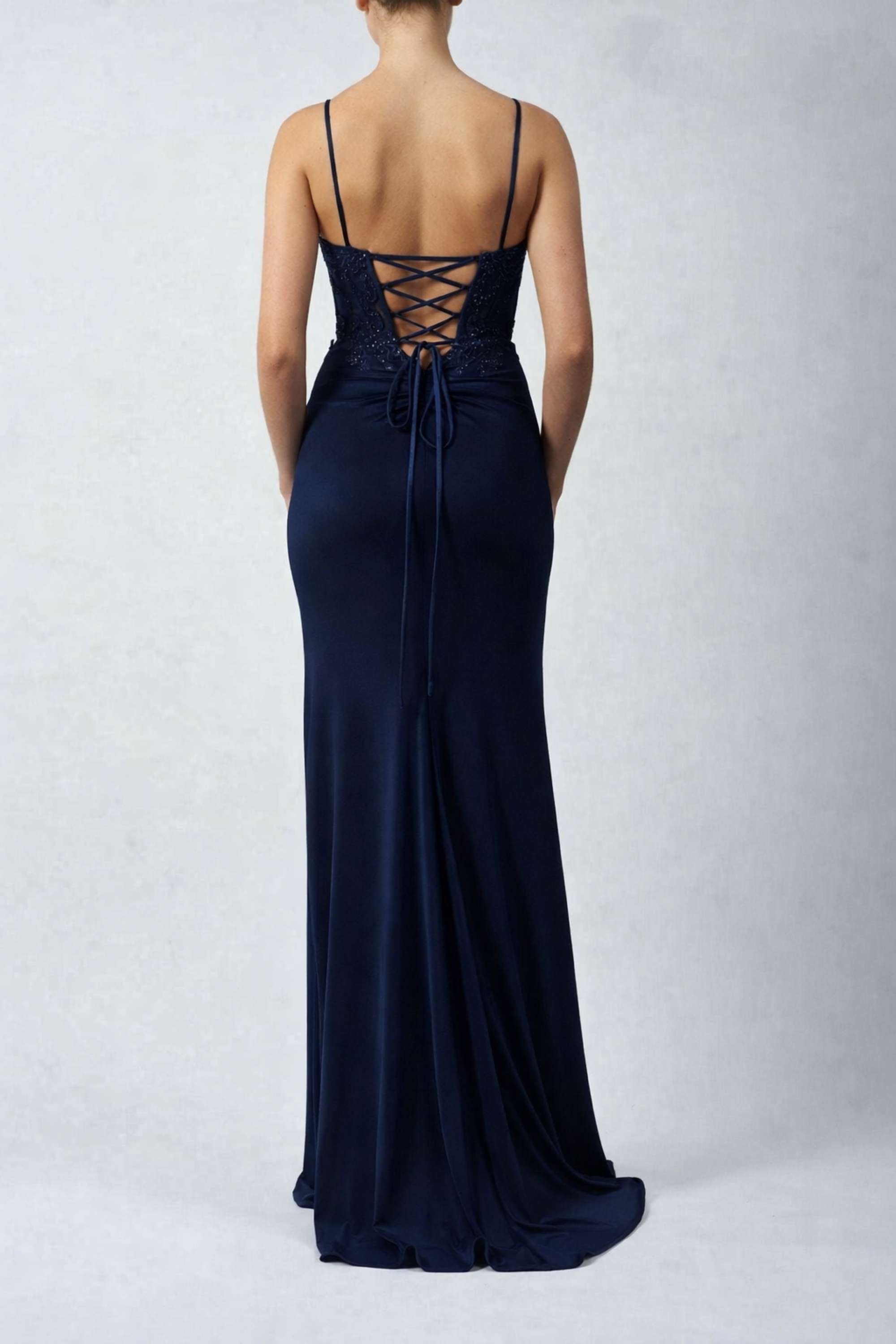 The Navy Tie Back Prom Dress is finished with a lace-up tie back that not only adds a romantic detail but also allows for an adjustable, figure-enhancing fit. A subtle thigh-high split brings a touch of allure while maintaining a graceful, polished feel. Crafted from soft stretch jersey, this gown ensures both comfort and elegance throughout the night.