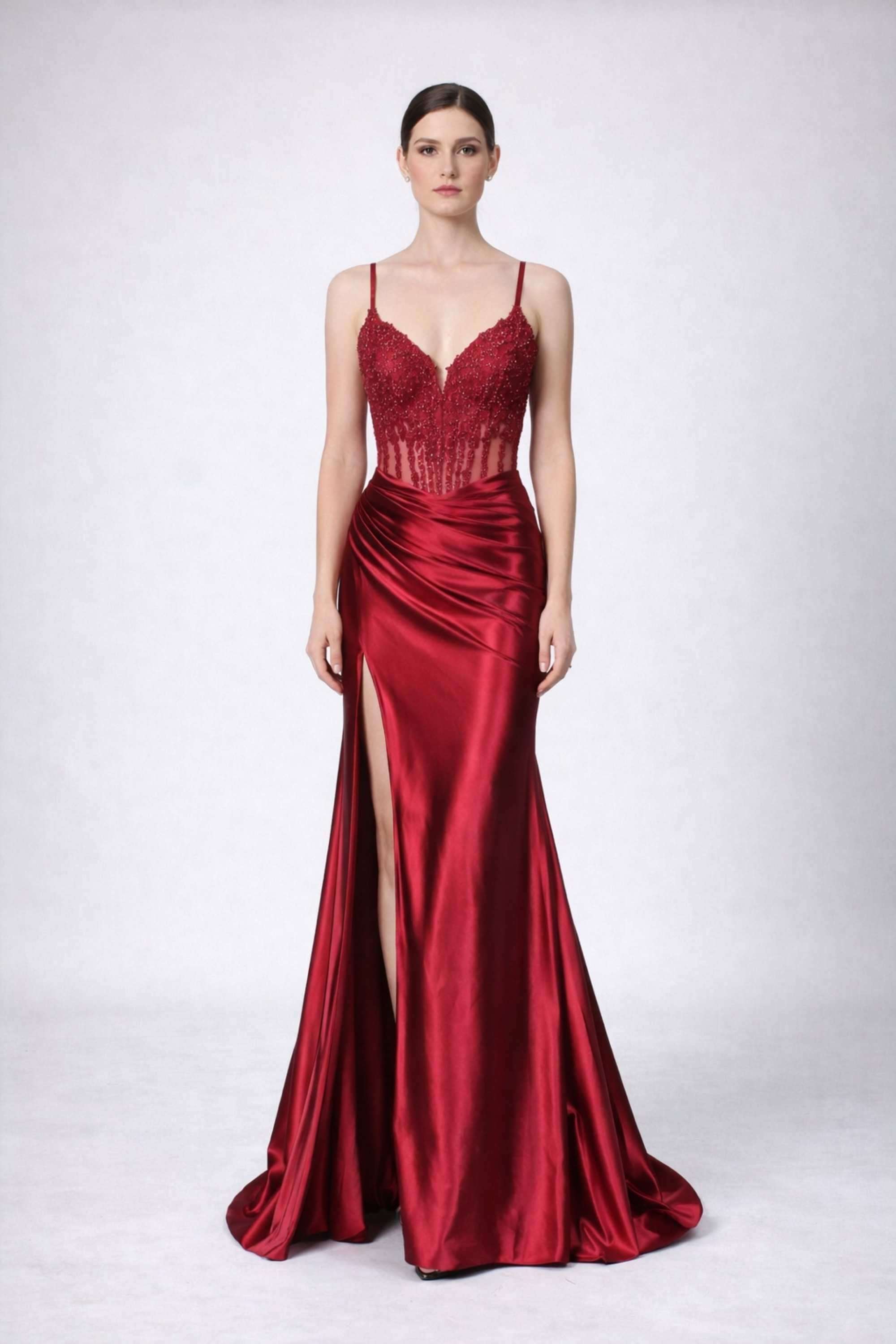 Step into the spotlight with the breathtaking Blake Wine Corset Satin Dress by Jessica Stuart. This exquisite piece combines luxurious satin fabric with intricate corset detailing to create a show-stopping silhouette that commands attention. The Blake Satin Corset Dress features an embellished bodice with delicate embroidery and mesh detailing that adds a touch of sensual elegance.