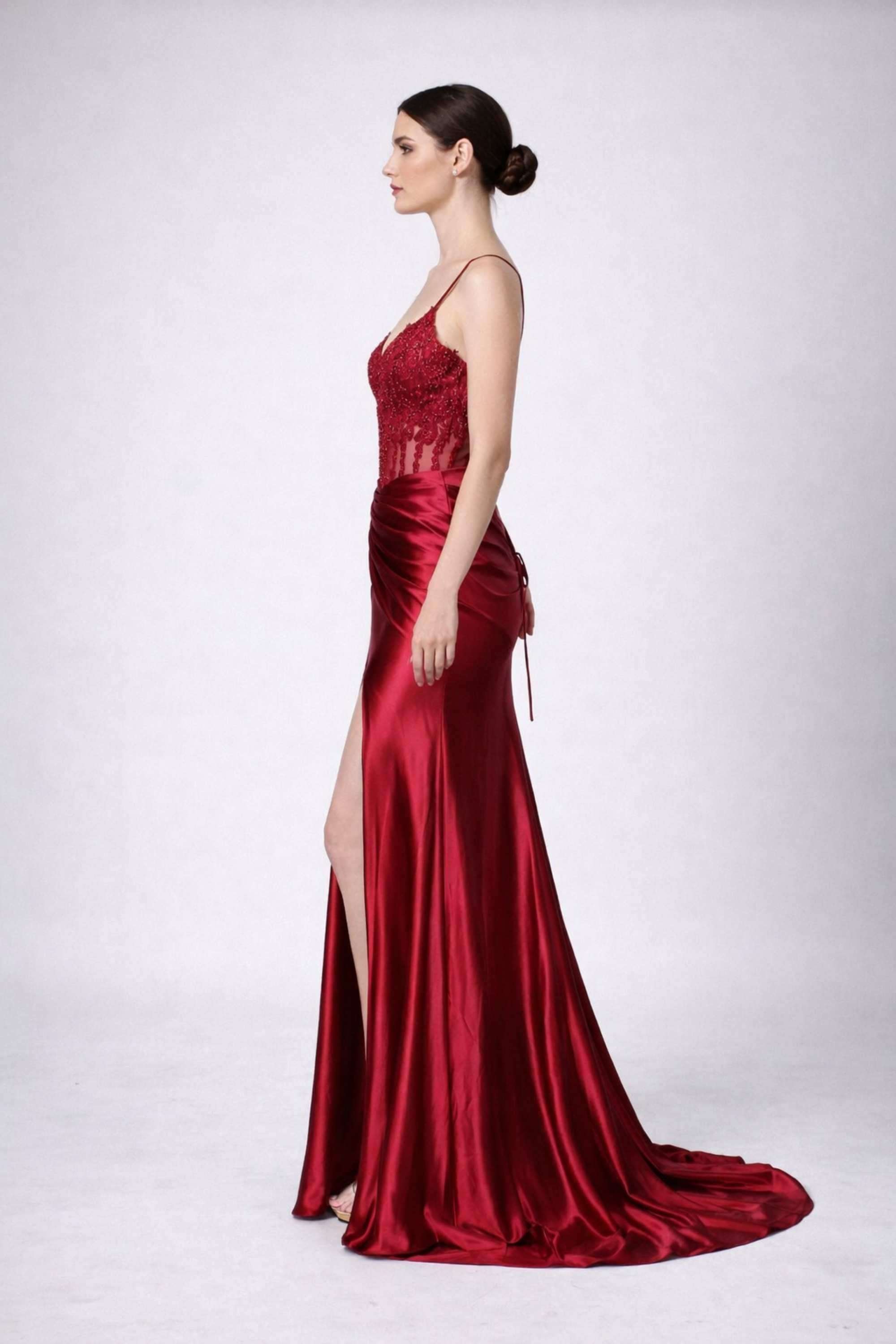 Experience the perfect blend of sophistication and allure with carefully crafted elements that elevate this dress to red-carpet status. The tie-back fastening allows for customizable fit while creating an unforgettable back view with elegant ruching. A dramatic leg slit adds movement and modern glamour to the flowing satin skirt, which features beautiful pleated detailing for added texture and dimension.