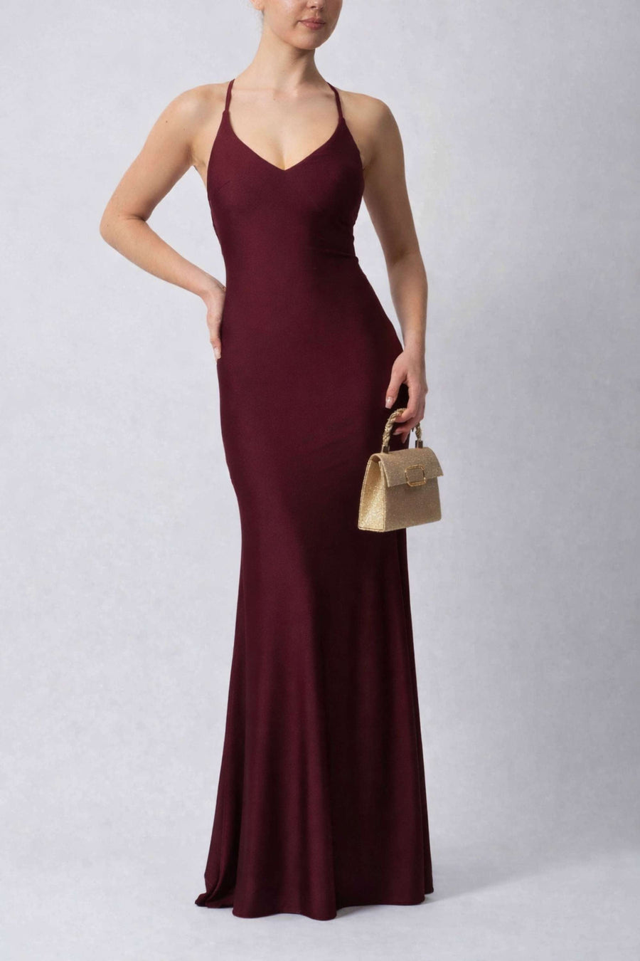 Style this wine backless prom dress with a sleek updo and statement earrings to highlight the back detail, and complete the look with metallic heels for effortless glamour.