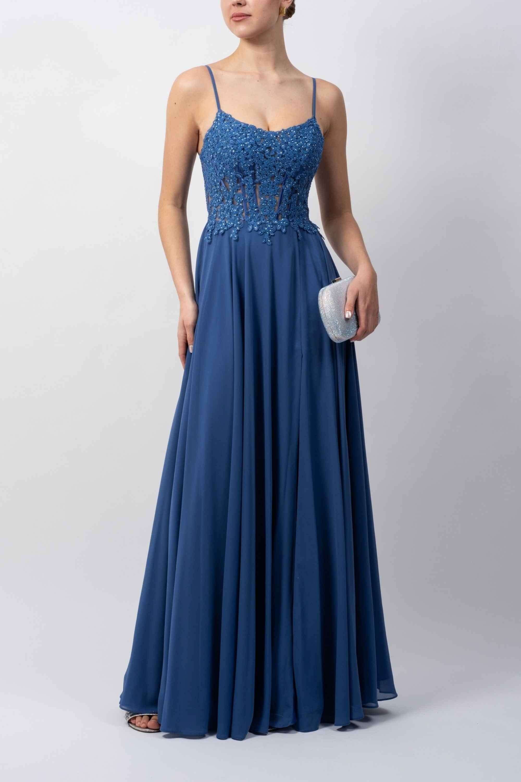 From the back, the lace-up tie-back detail creates a striking focal point while allowing an adjustable fit. The flowing chiffon skirt drapes effortlessly to the floor, enhancing the romantic silhouette of this Chambray Chiffon Gown. The cool chambray tone offers a fresh, sophisticated alternative to classic evening shades.