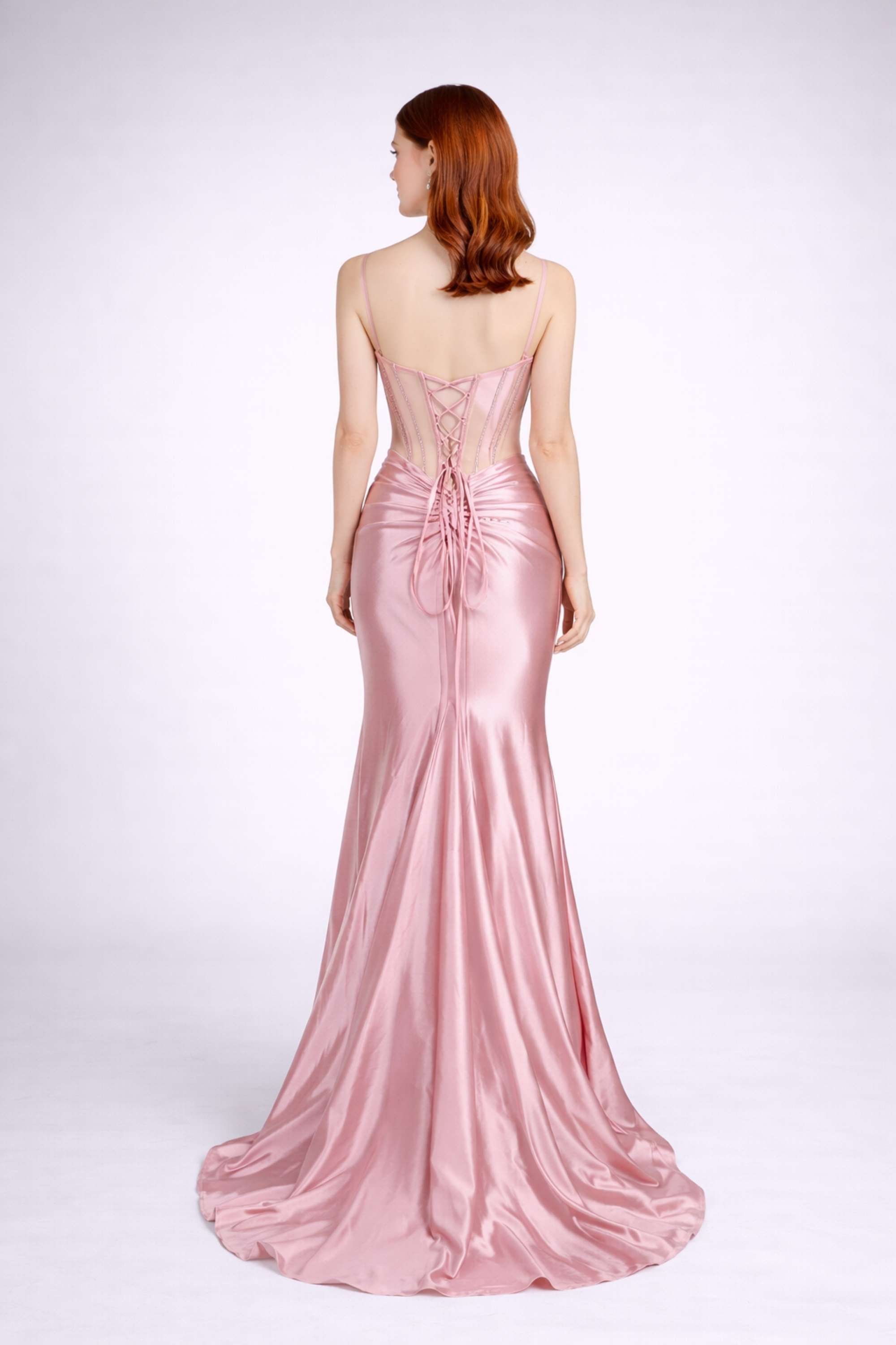 This gown beautifully shapes into a mermaid silhouette, embracing your curves and flowing fluidly into a luxurious, floor-grazing hem. A carefully positioned side slit adds a touch of drama and ease, enhancing your sophisticated aura with an alluring blend of grace and daring style.