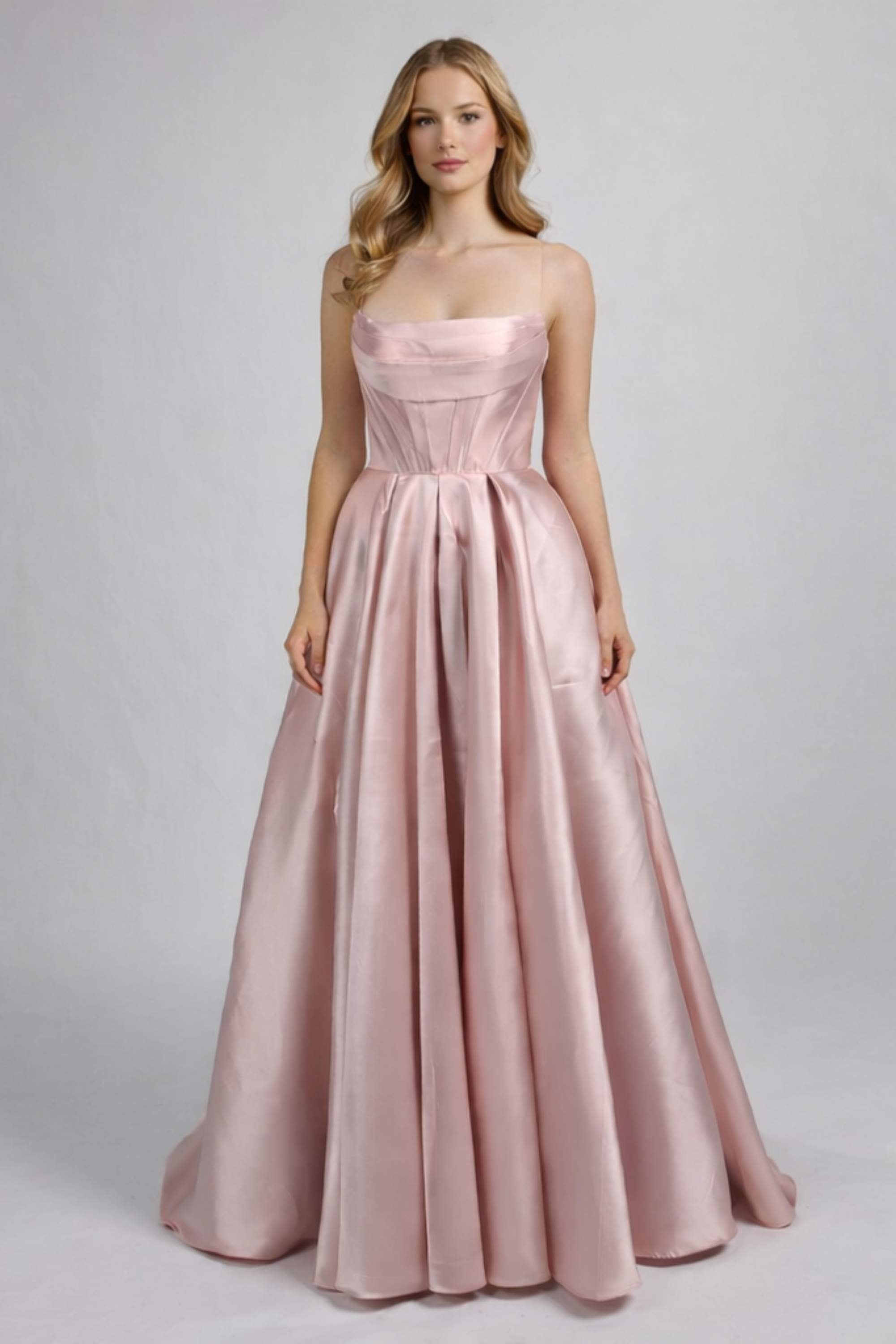 Prepare to make a grand entrance with the Jessica Stuart Light Pink Satin Ballgown, the perfect blend of luxury and practicality for any memorable occasion, especially prom. This light pink ball gown prom dress is crafted from exquisite satin that drapes beautifully to create an extraordinary silhouette. Its timeless strapless design features a classic draped bodice, while the corset-style back ensures a tailored fit and captivates with exquisite lace-up detailing.