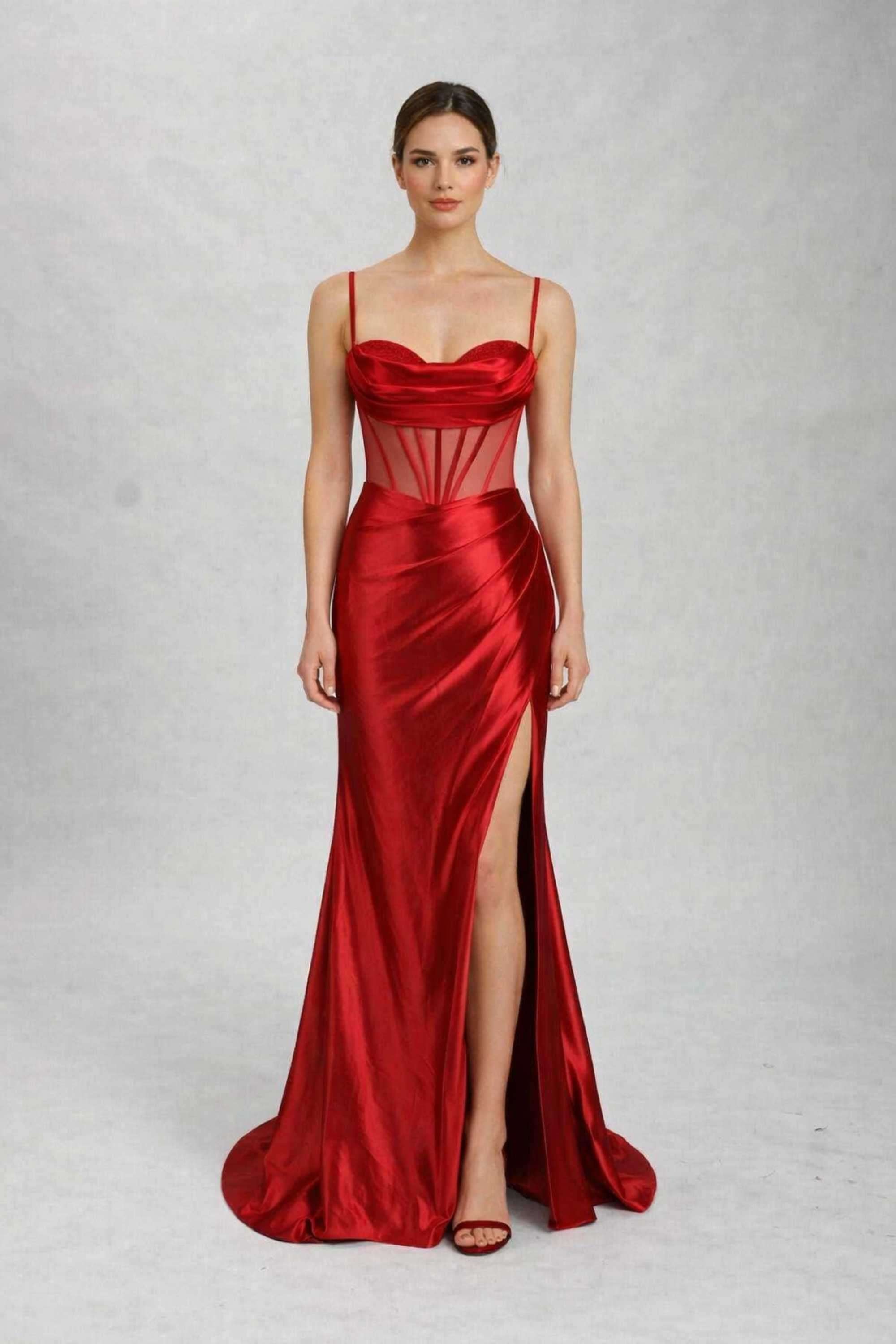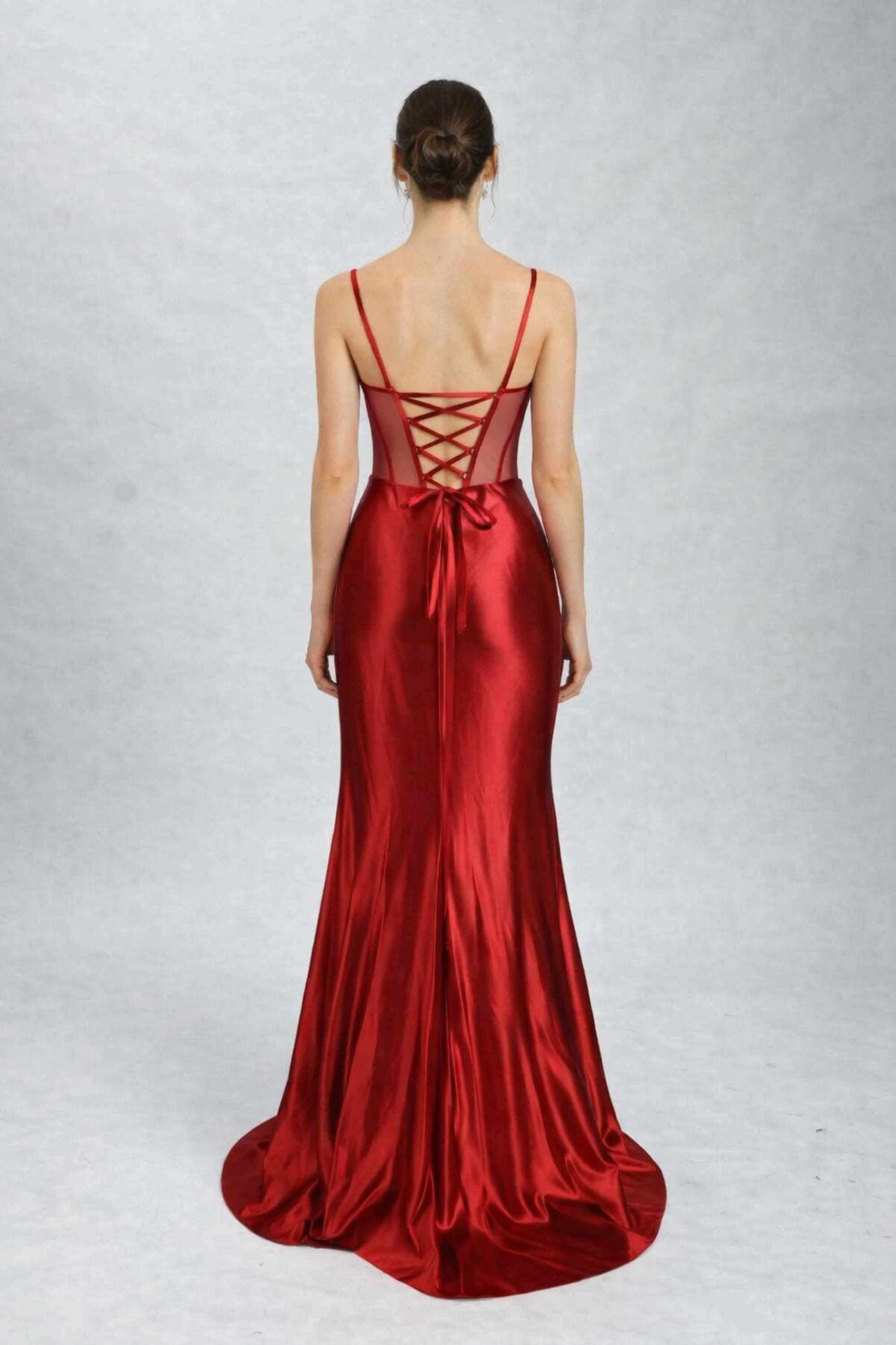 Red Corset Prom Dress ASHLEY Beaded with Mesh Panels