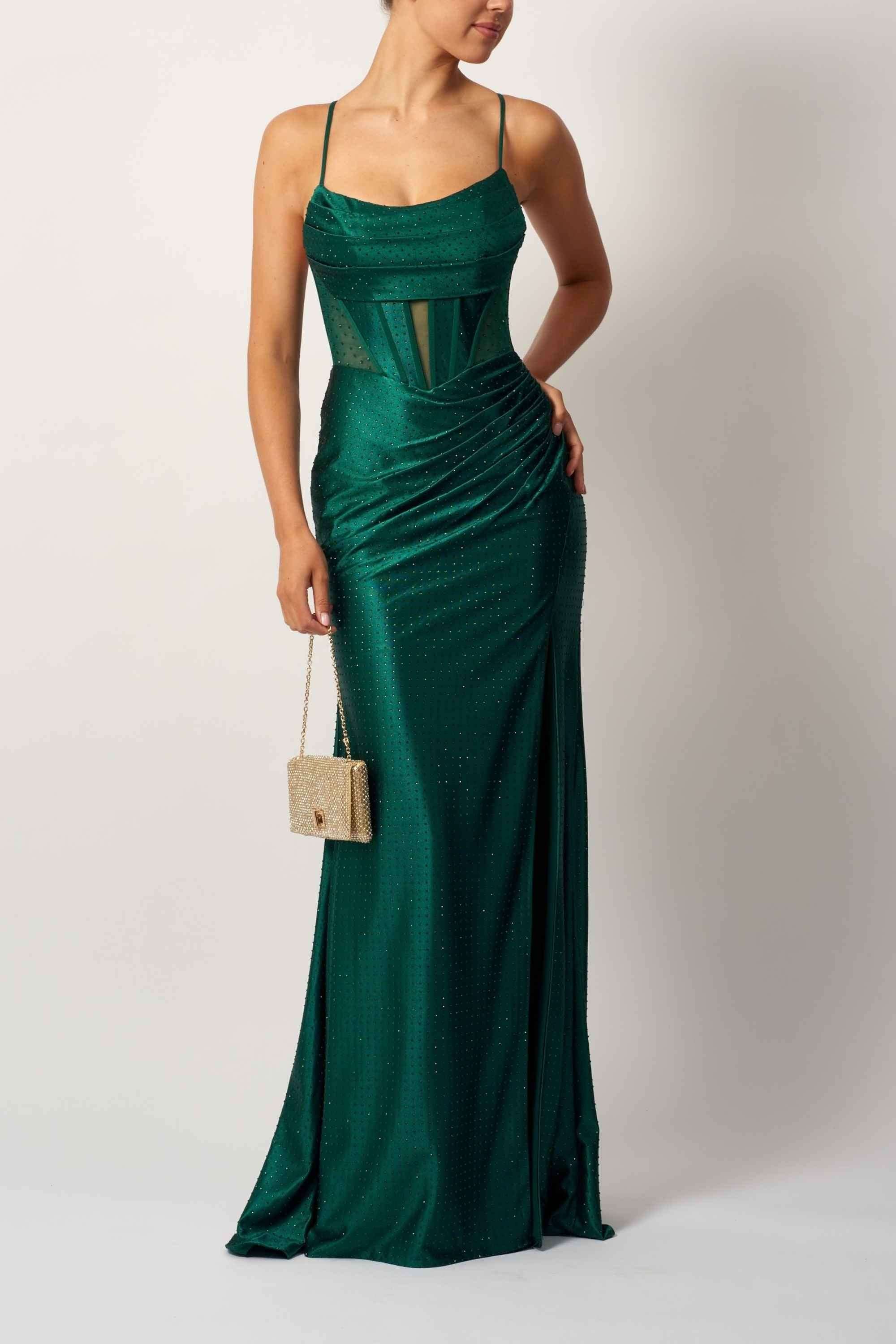 Mascara MC113511 Pleated Tie Back Forest Green Satin Dress