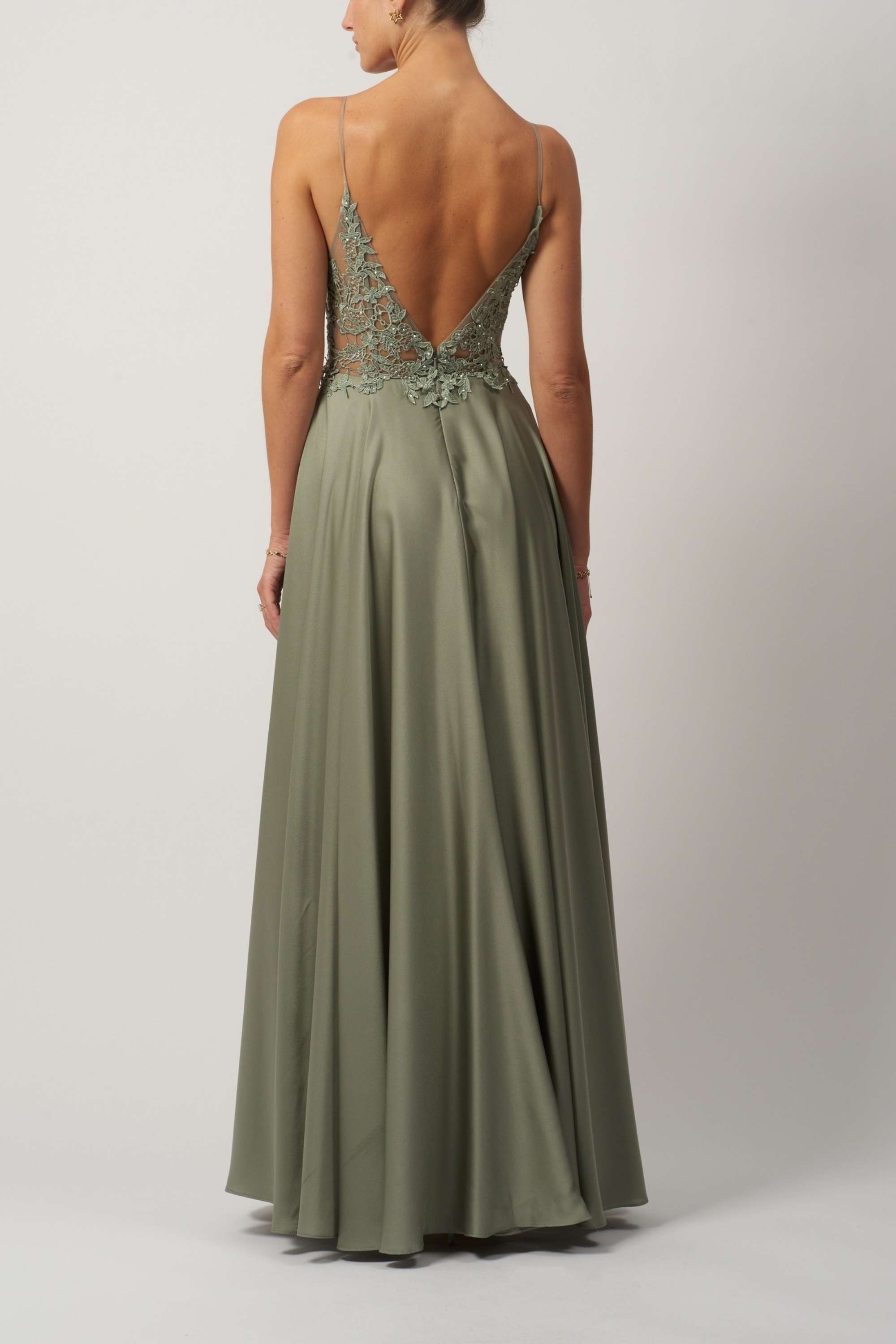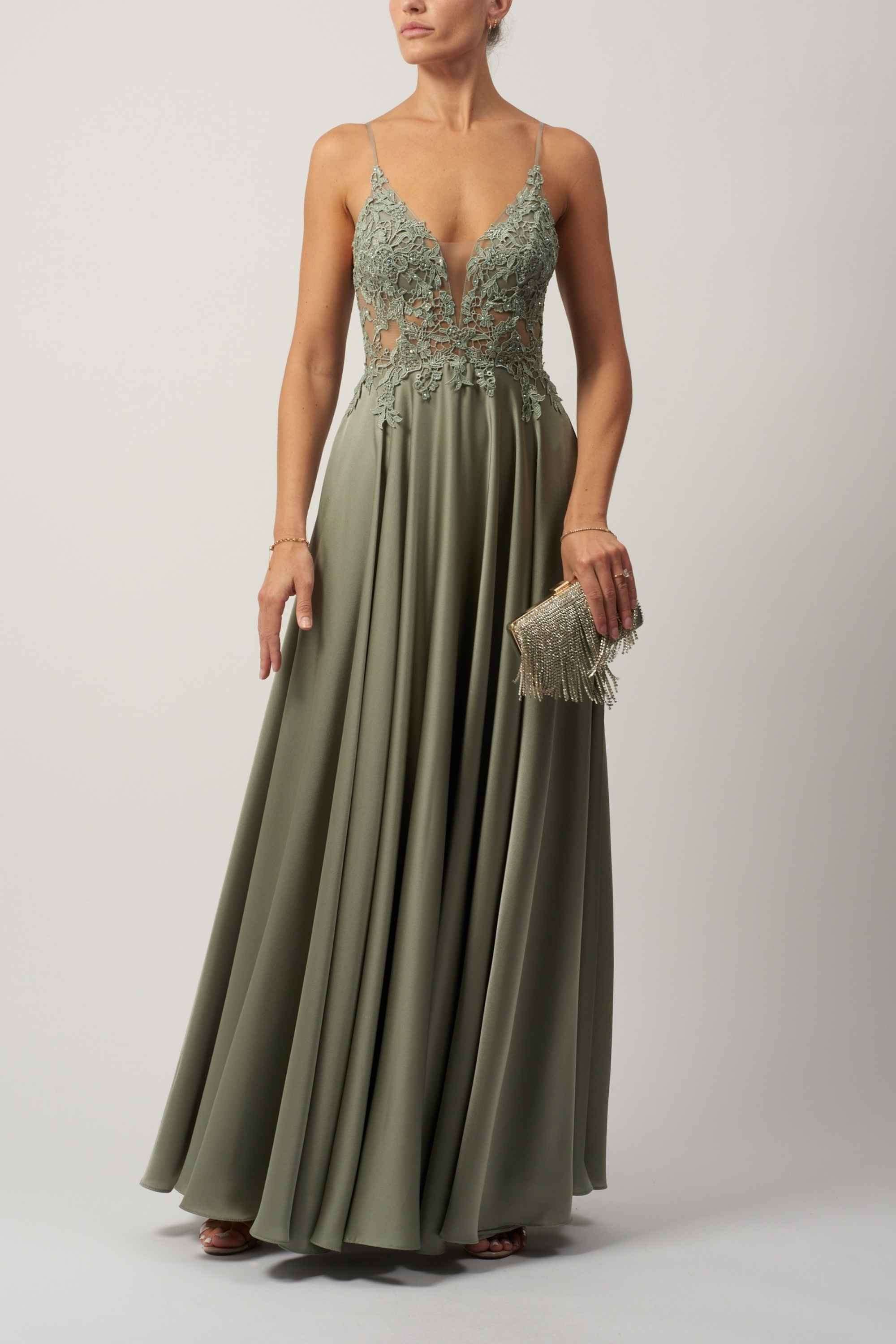 Unleash Your Elegance with the stunning Khaki Satin Evening Dress, the Mascara MC12204 EMB Satin Khaki Dress. Step into a world of sophistication with this exquisite gown by MASCARA London, showcasing a daring plunging V-neckline and intricate lace detailing that enchants from every angle.