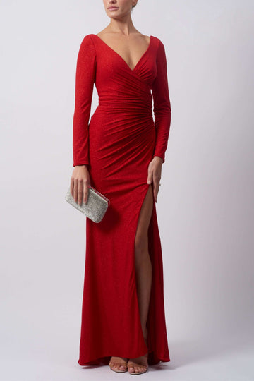 Rotes Glitzer-Langarmkleid mit geraffter Taille MC121054
