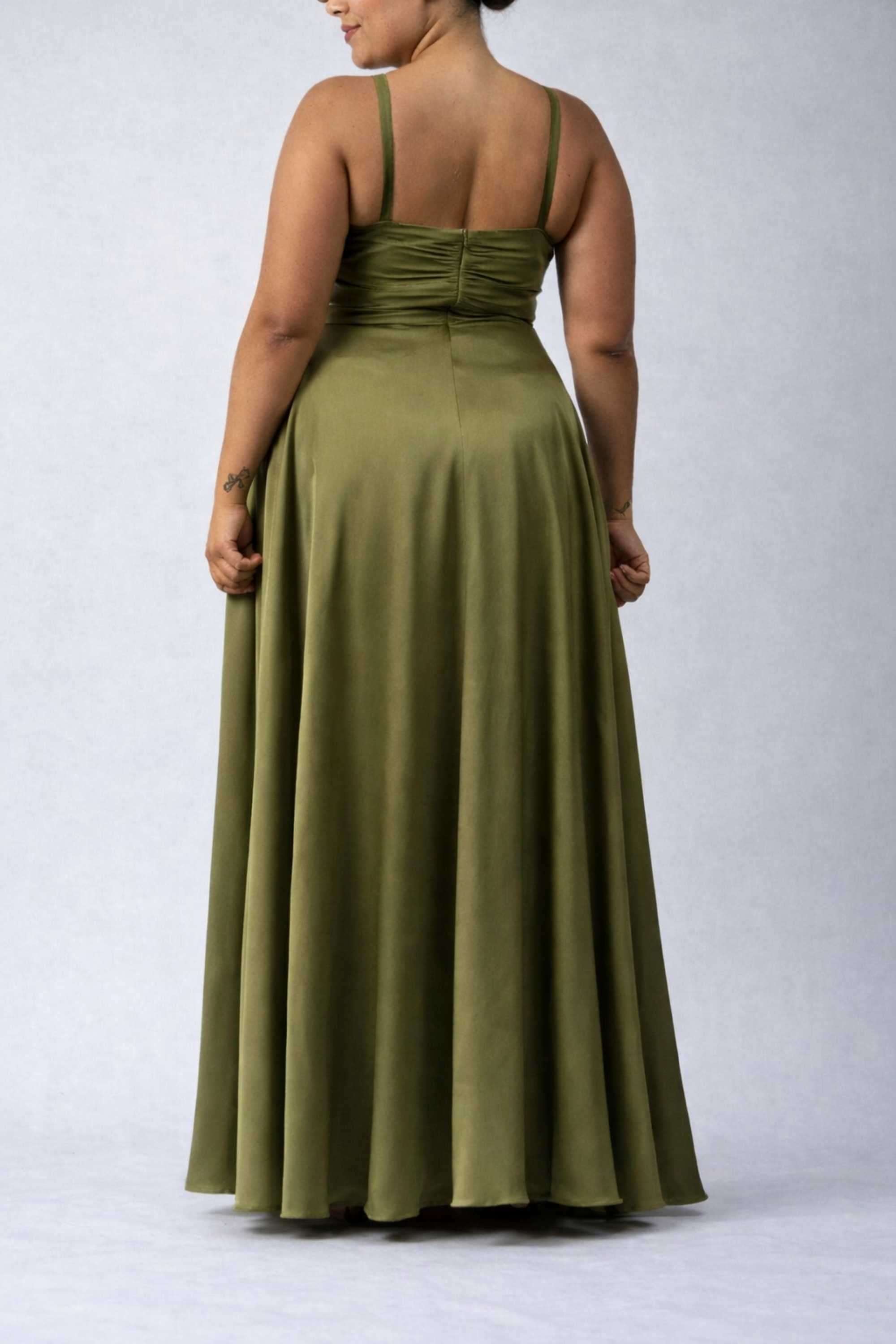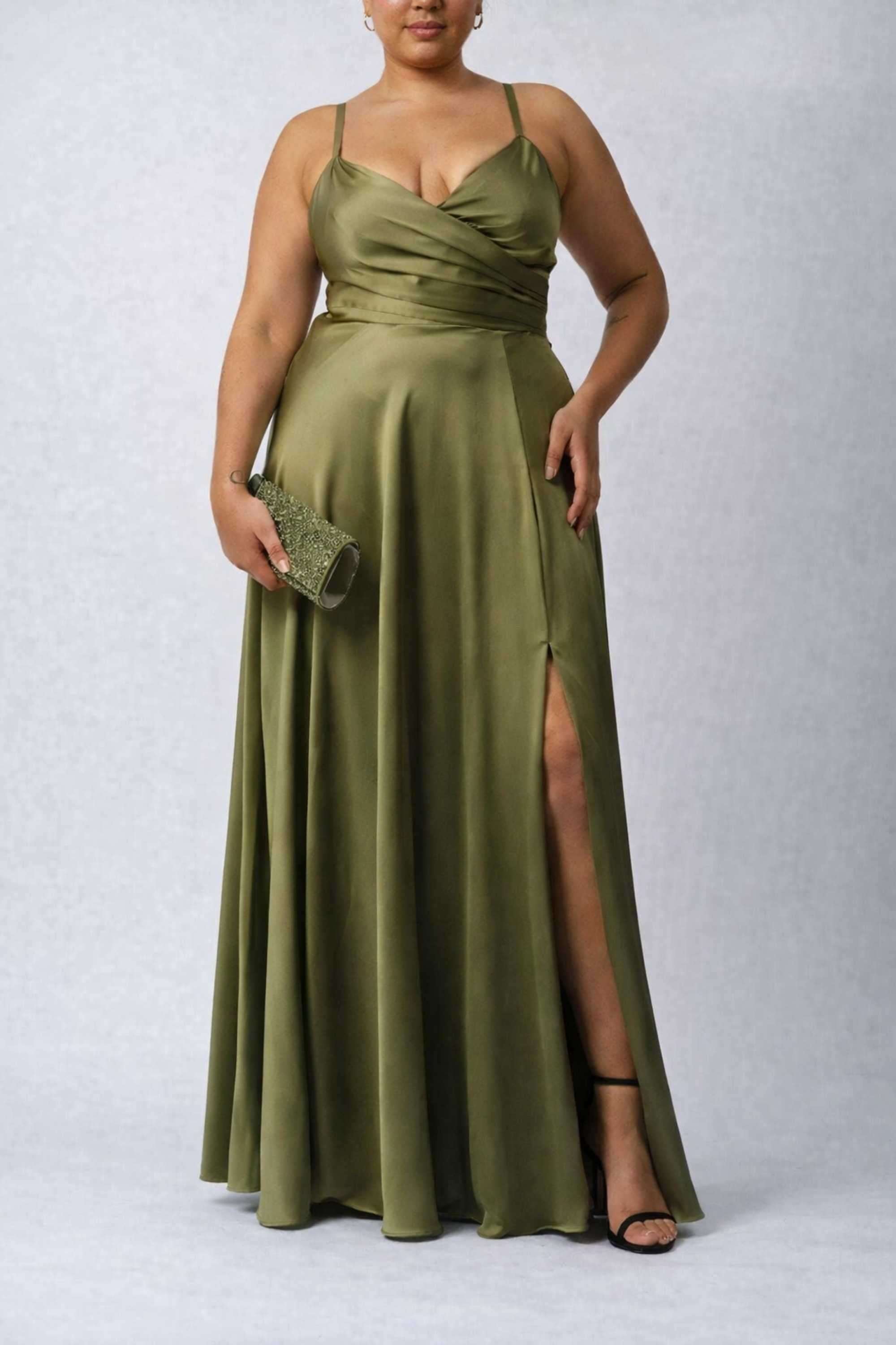 Olivgrünes, kurviges, plissiertes Satin-Abendkleid MC519307