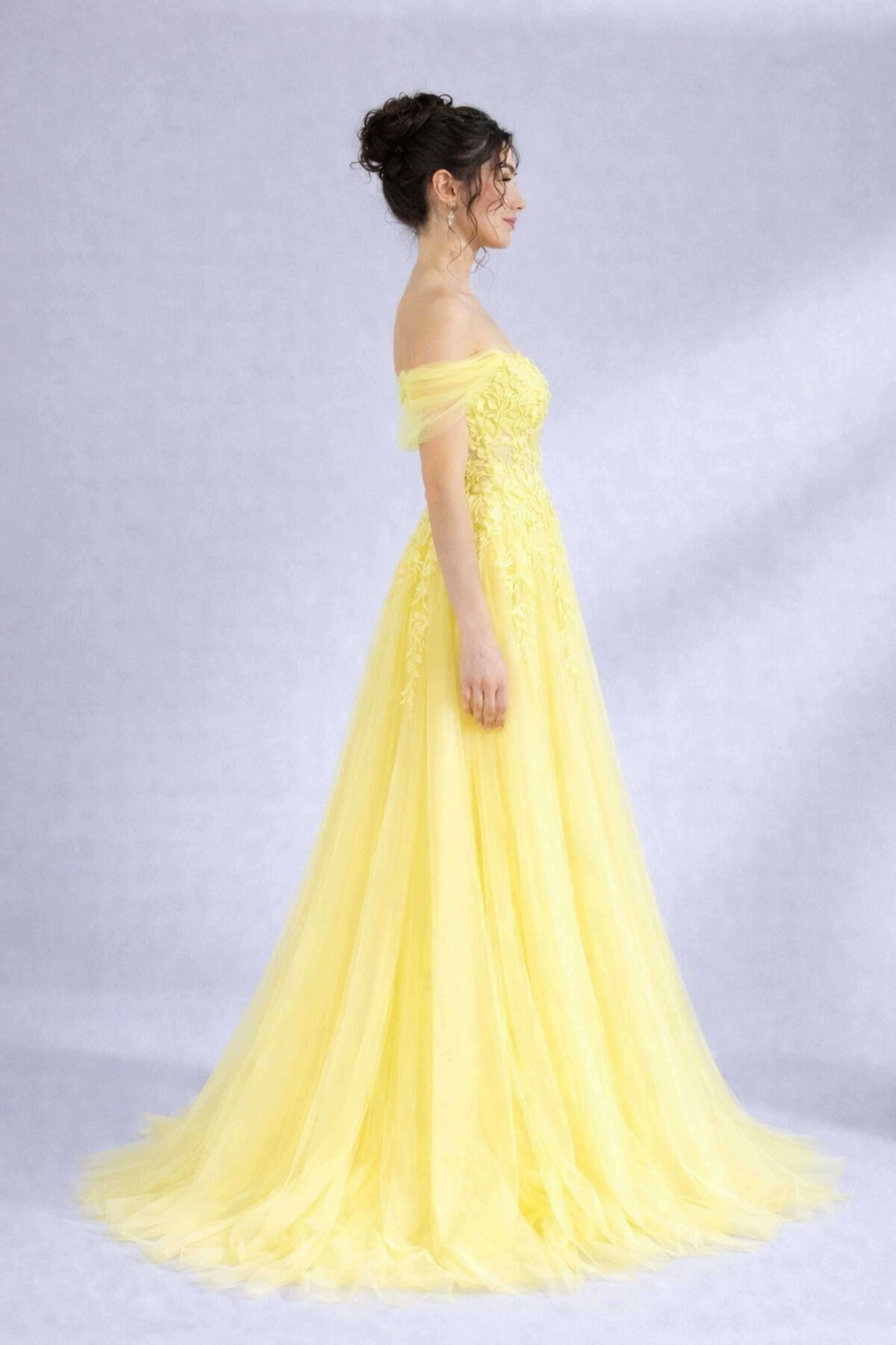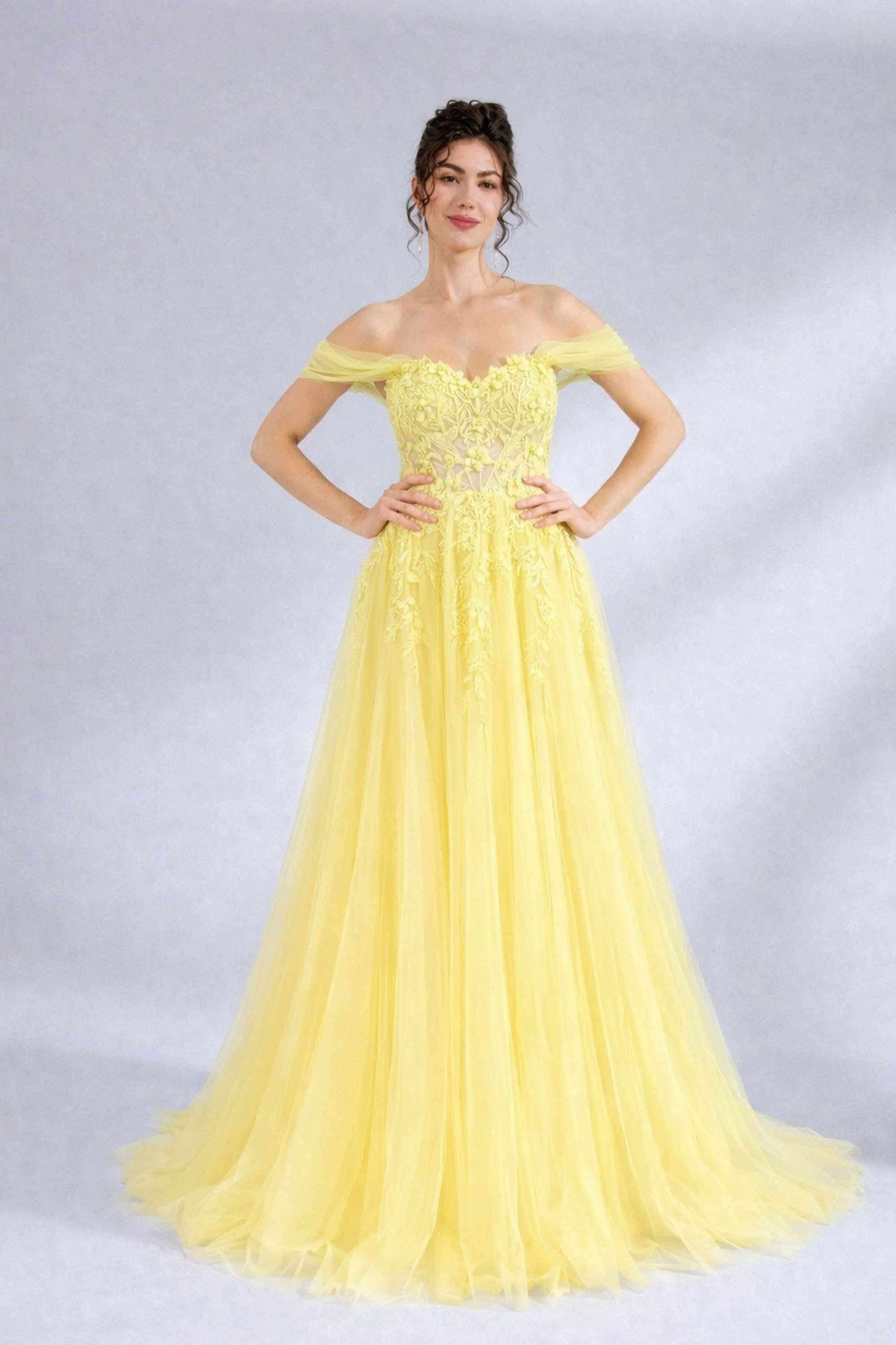 Gönnen Sie sich die verträumte Eleganz des neuen gelben Tüllkleids mit Korsettoberteil YLONA von Jessica Stuart. Sein aufwendiges Sweetheart-Spitzendesign ist mit zarter Spitze, 3D-Blumen, Perlen und kaskadierenden Applikationen verziert, während die Stäbchen auch ohne Träger für tadellosen Halt sorgen. Für zusätzliche Vielseitigkeit verfügt das Kleid über abnehmbare Schulterträger aus Netztüll. Der weite Rock besteht aus mehreren Lagen luxuriösem Tüll.