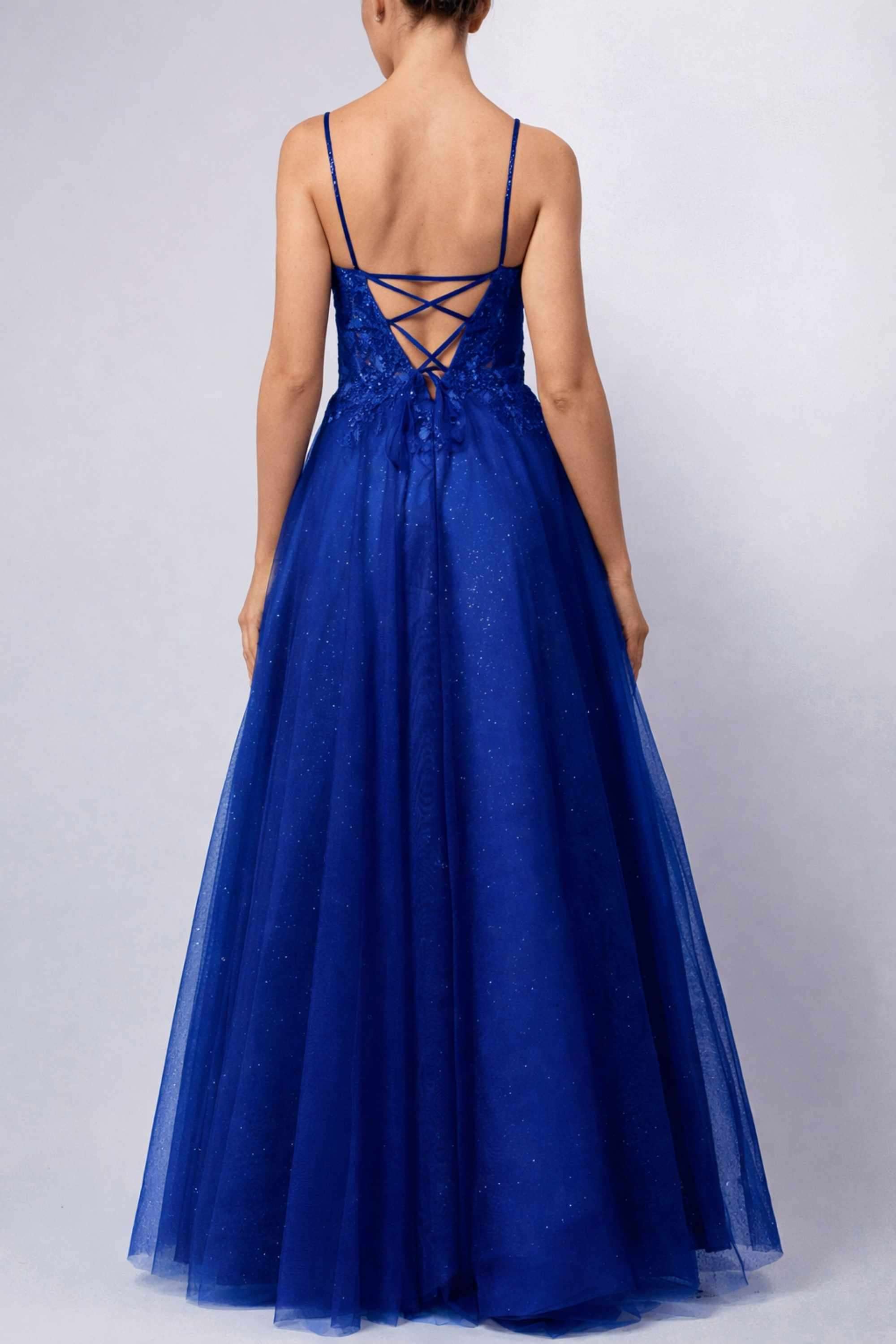 Confectionnée en tulle élégant et ornée de paillettes scintillantes, cette robe de bal ne passe pas inaperçue. Sa jupe ample ondule avec grâce au moindre mouvement, tandis que sa teinte bleu roi lui confère une touche de sophistication et de fantaisie.