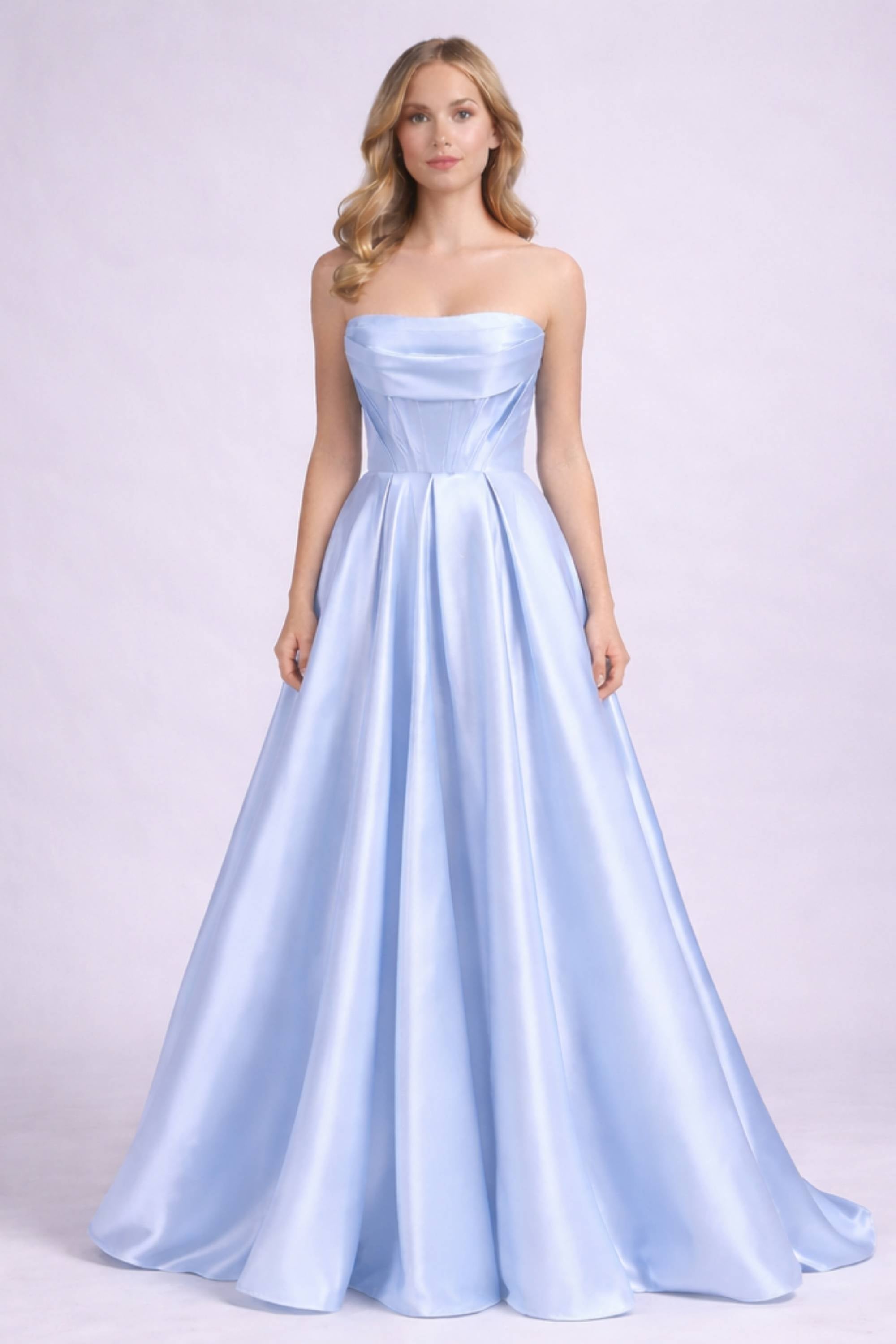Brillez de mille feux avec la robe Carmen, une robe de bal en satin bleu clair à couper le souffle, conçue pour faire sensation au bal de promo 2026 et à toutes vos occasions spéciales. Avec sa confection impeccable et sa teinte bleu ciel féérique, ce chef-d'œuvre bustier allie une élégance intemporelle à une sophistication moderne pour un look inoubliable.