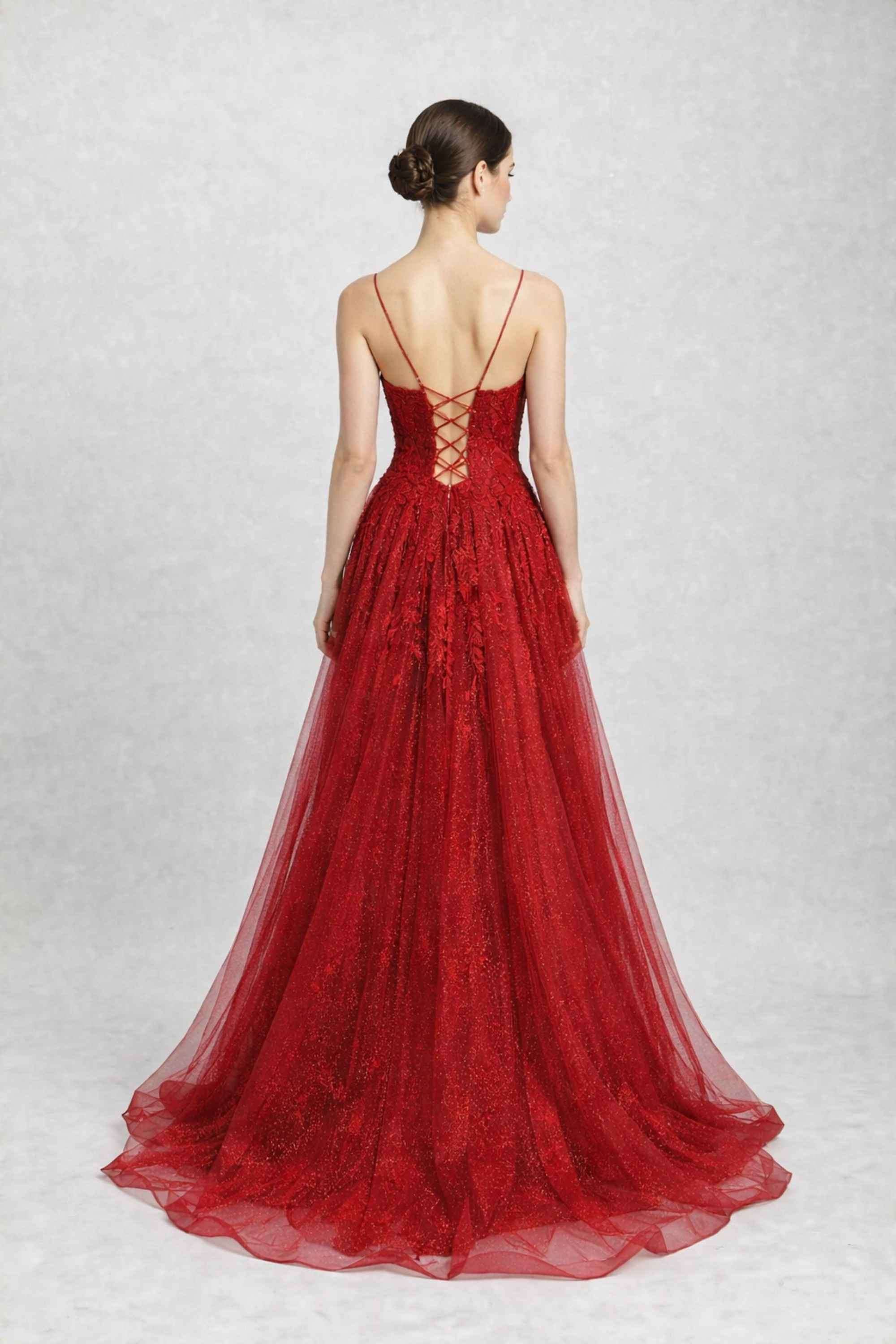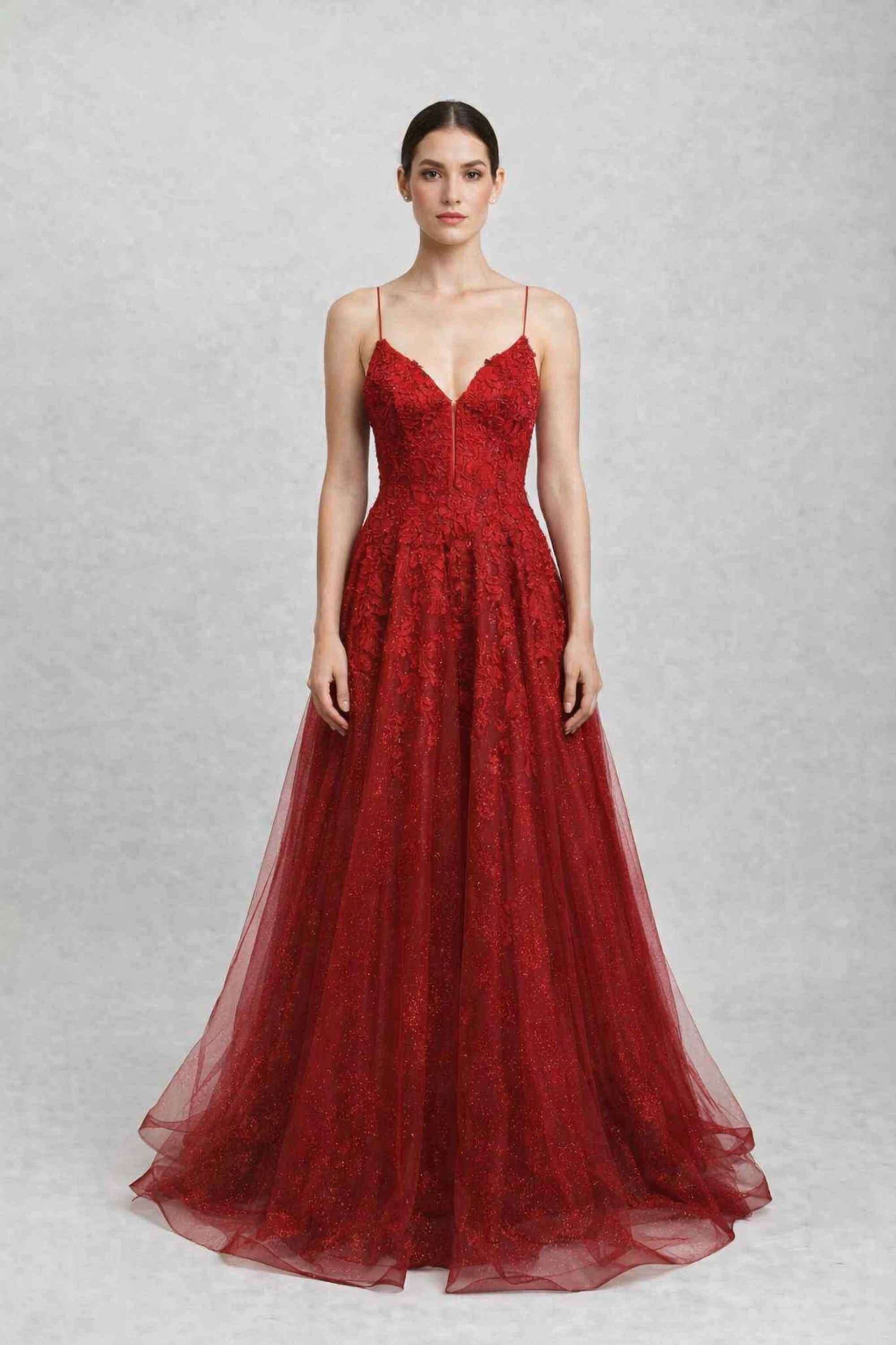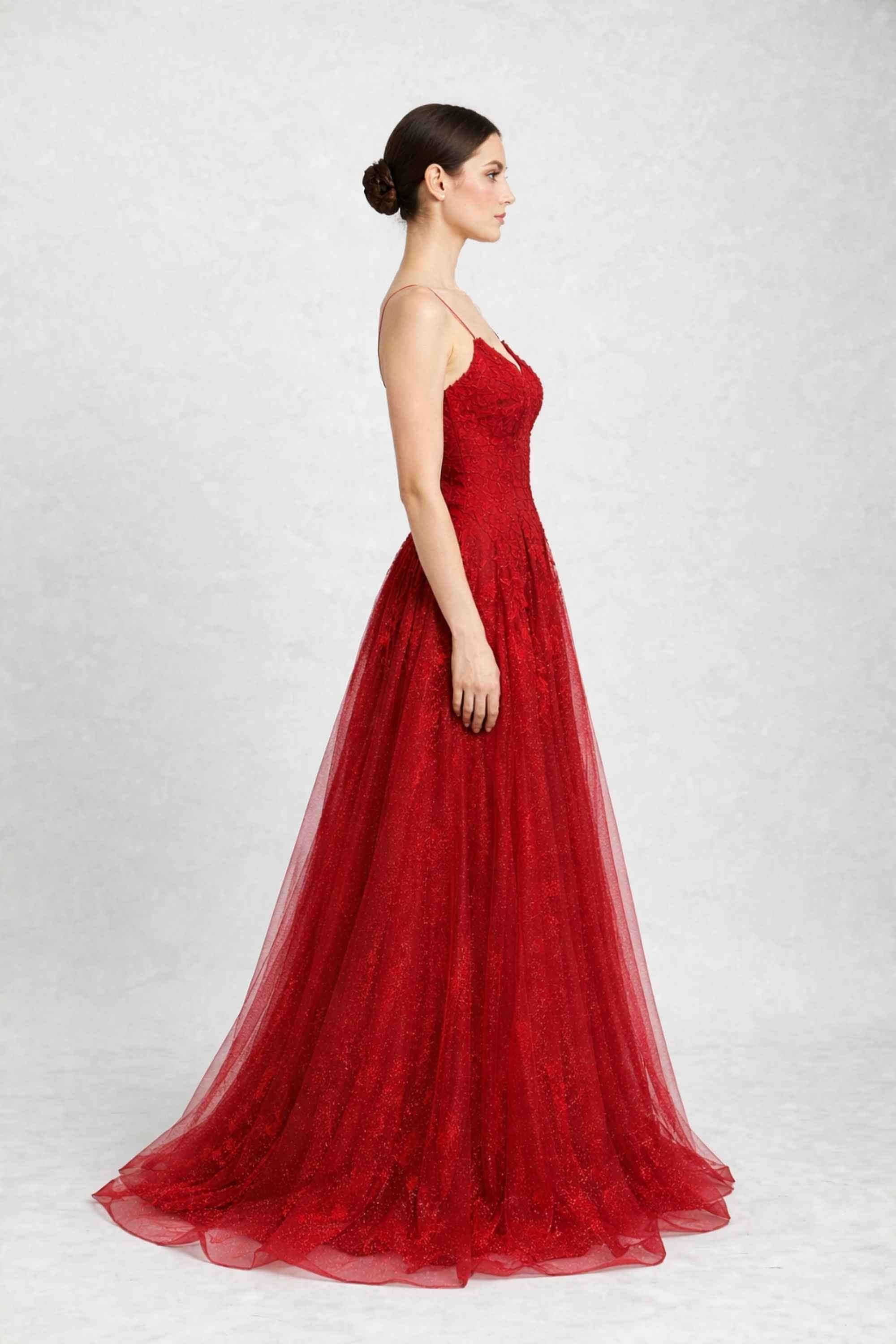- Tissu luxueux : tulle rouge scintillant orné d’appliqués floraux délicats.