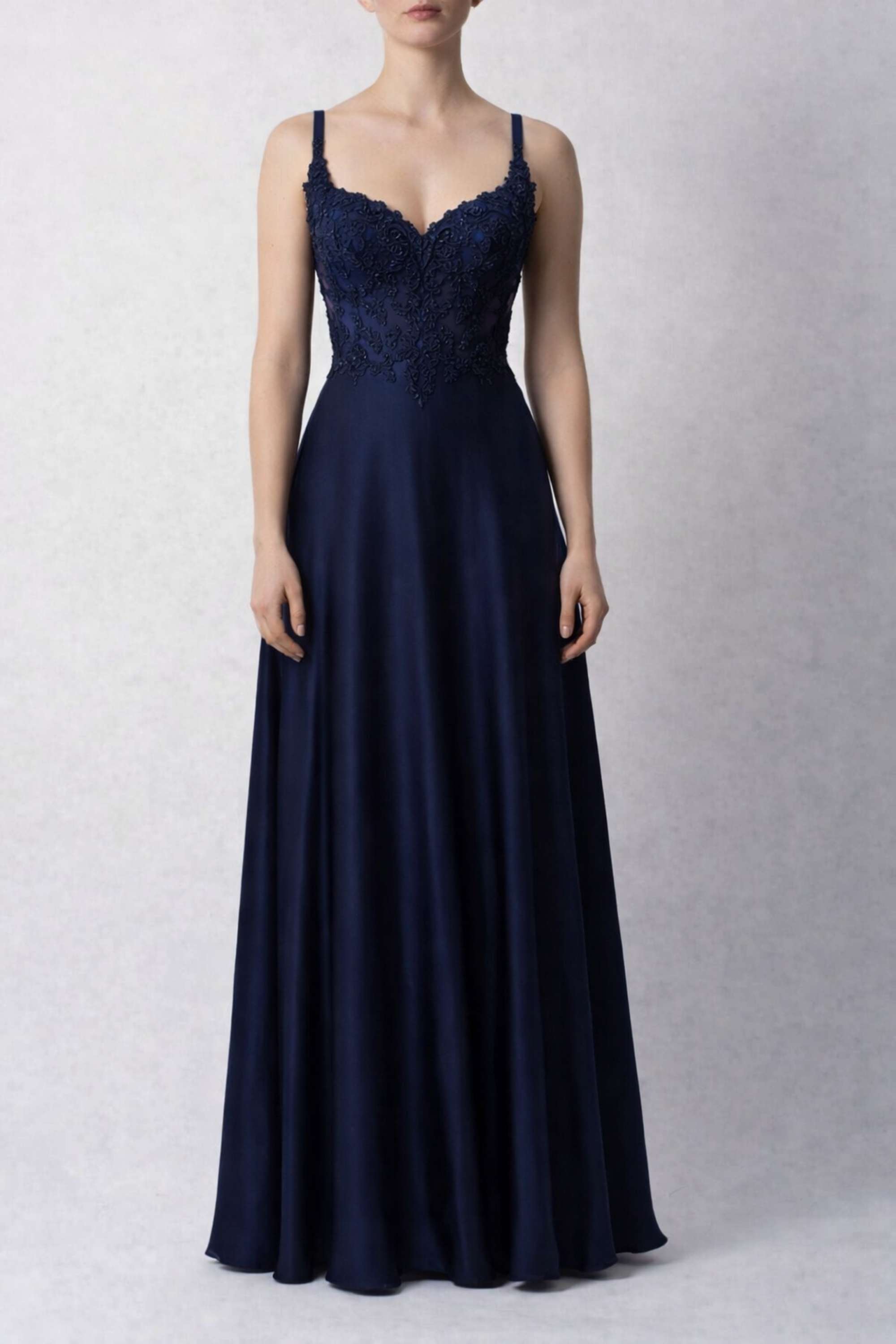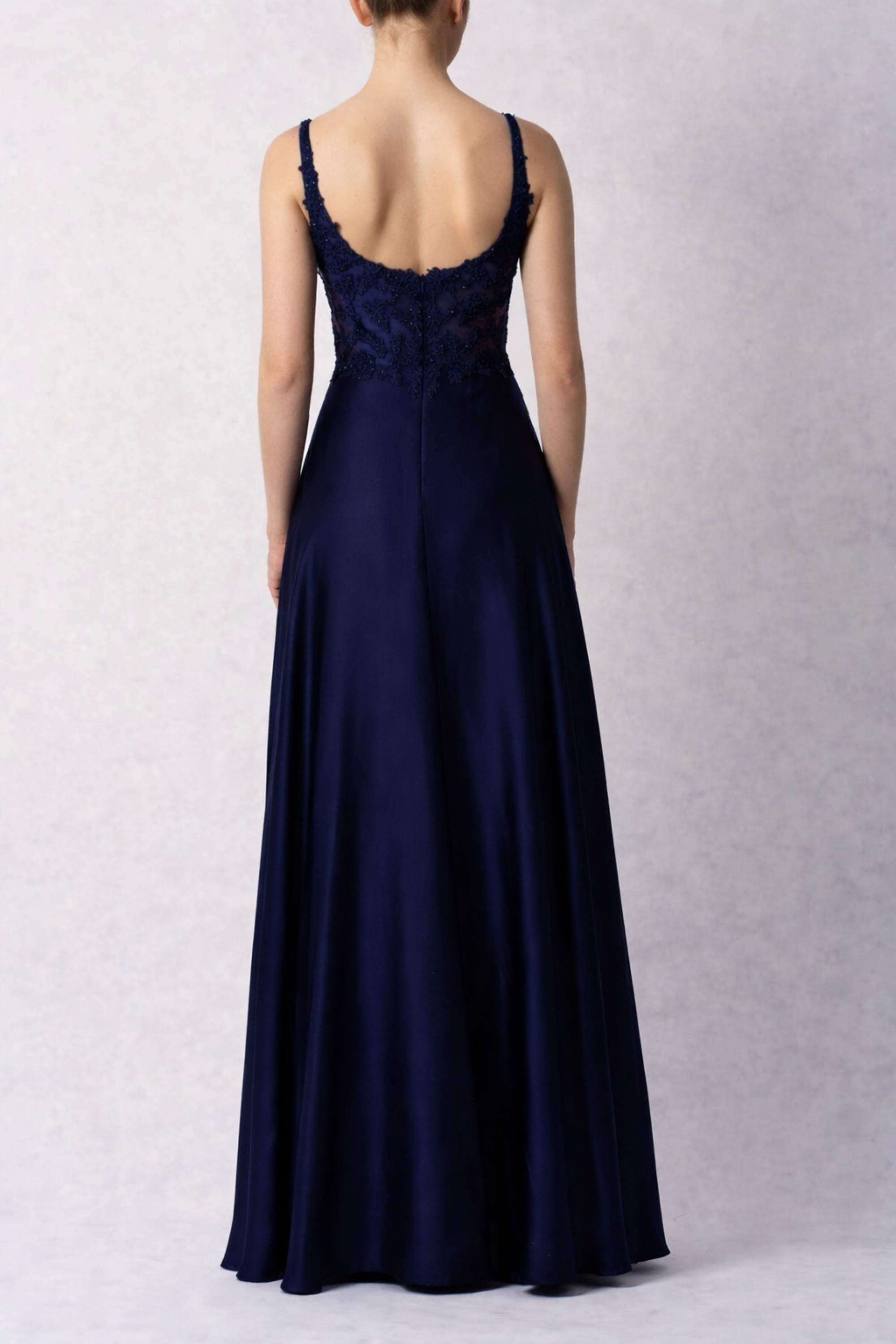 Robe de soirée bleu nuit en satin de Mascara MC124410