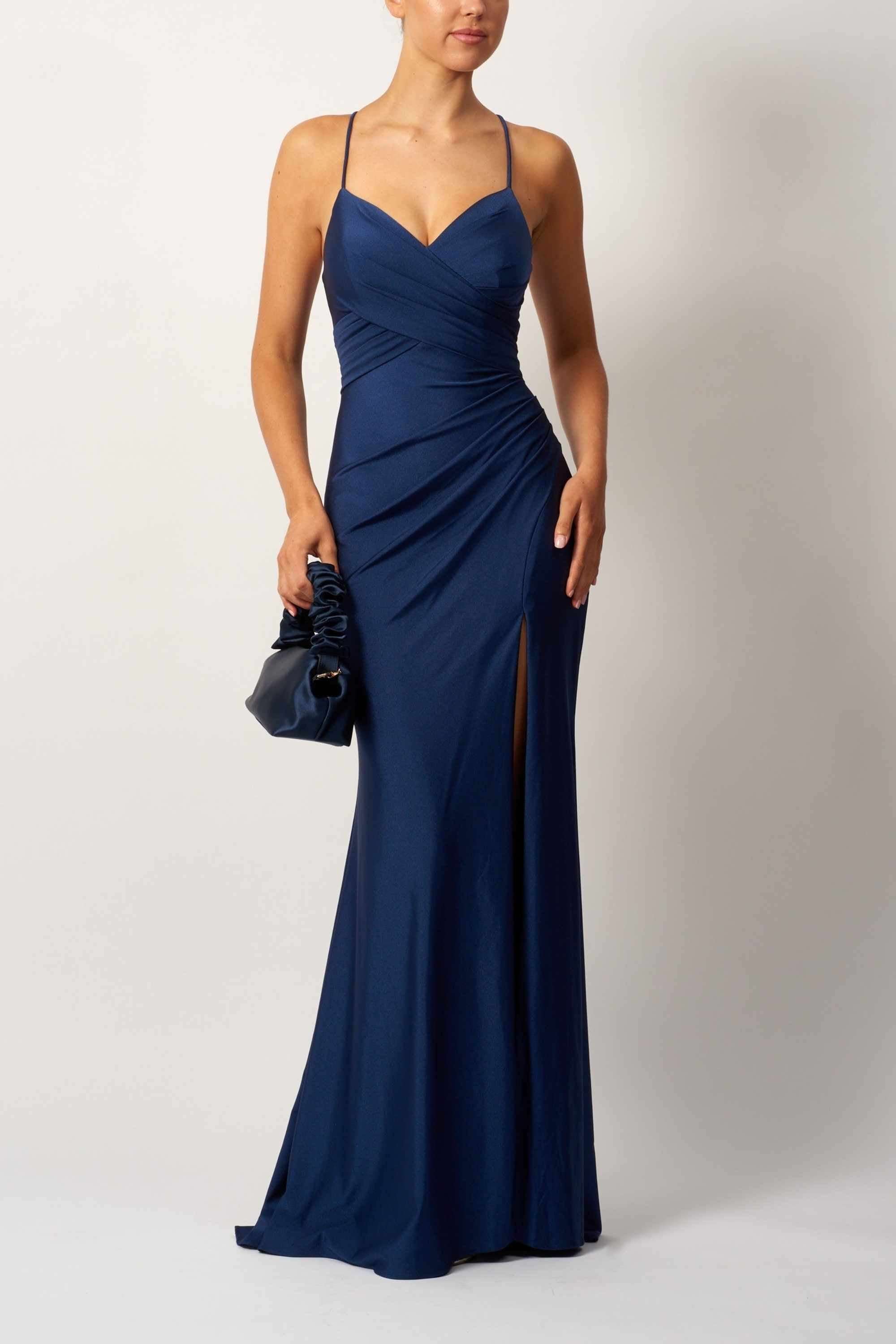 La fente discrète jusqu'à la cuisse apporte du mouvement et une touche de séduction, parfaitement équilibrée par les lignes épurées et minimalistes de la robe. Confortable et élégante, la robe en jersey bleu marine à plis croisés est idéale pour les bals de fin d'année, les soirées et les occasions formelles où le glamour discret est de mise. Conçue pour accompagner vos mouvements, elle offre style et confort pour de longues soirées festives.