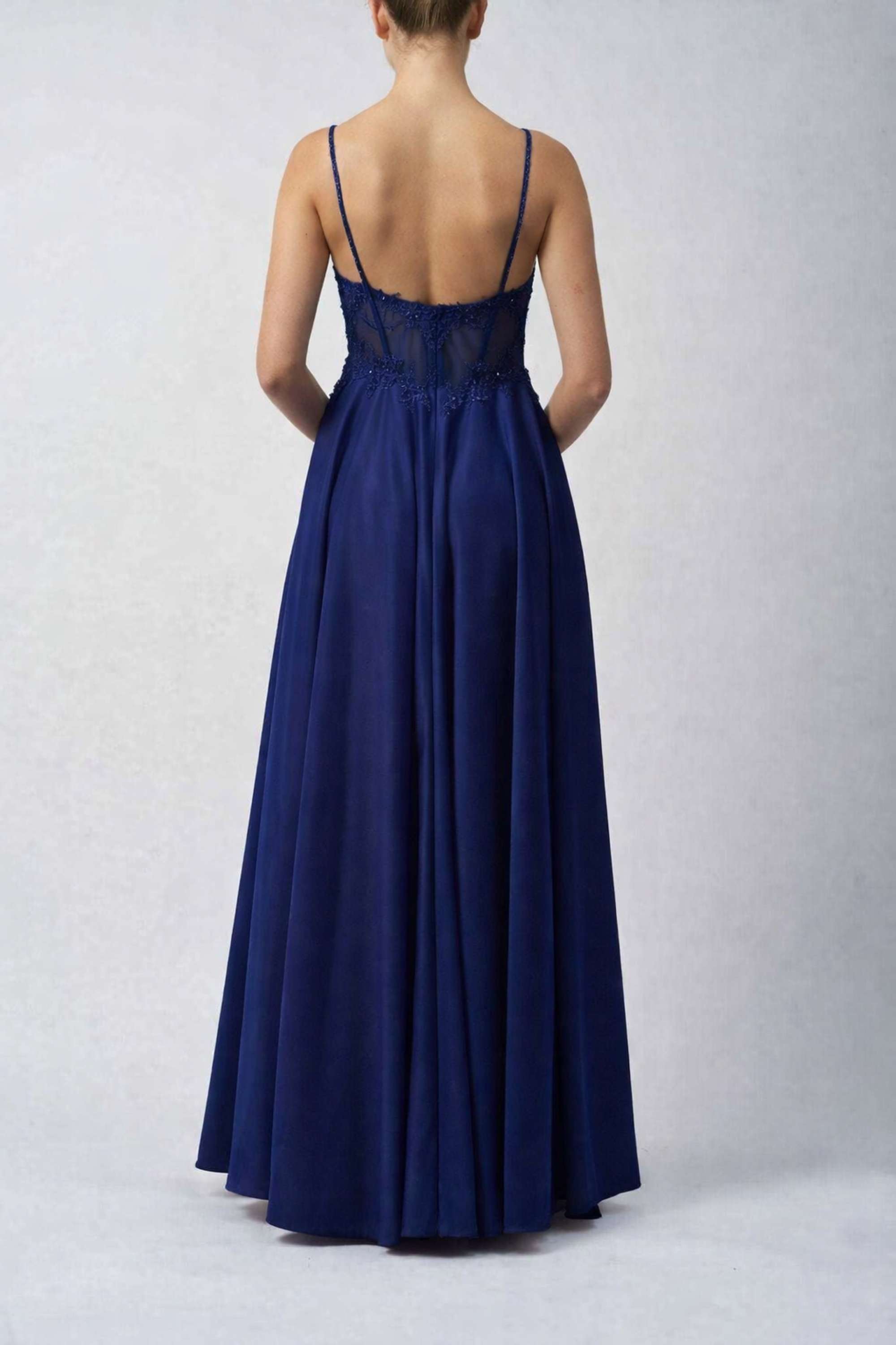 Sublimez votre élégance avec notre robe de bal en satin bleu marine MC123218. Sa silhouette raffinée et ses détails délicats vous garantissent un look intemporel. Confectionnée en satin lisse, cette robe présente un corsage subtilement orné d'un effet de transparence qui apporte de la profondeur sans alourdir la silhouette. De fines bretelles et un décolleté légèrement arrondi complètent harmonieusement votre allure féminine.