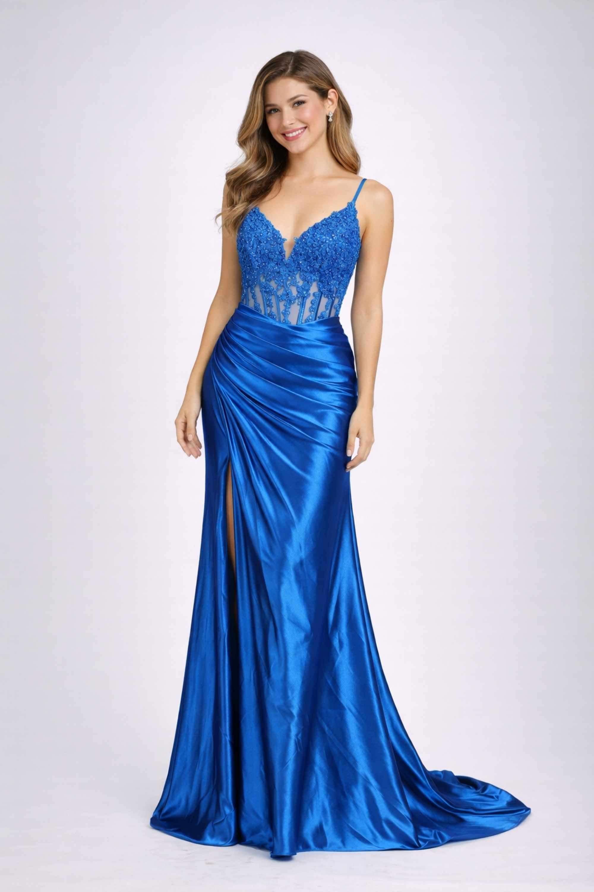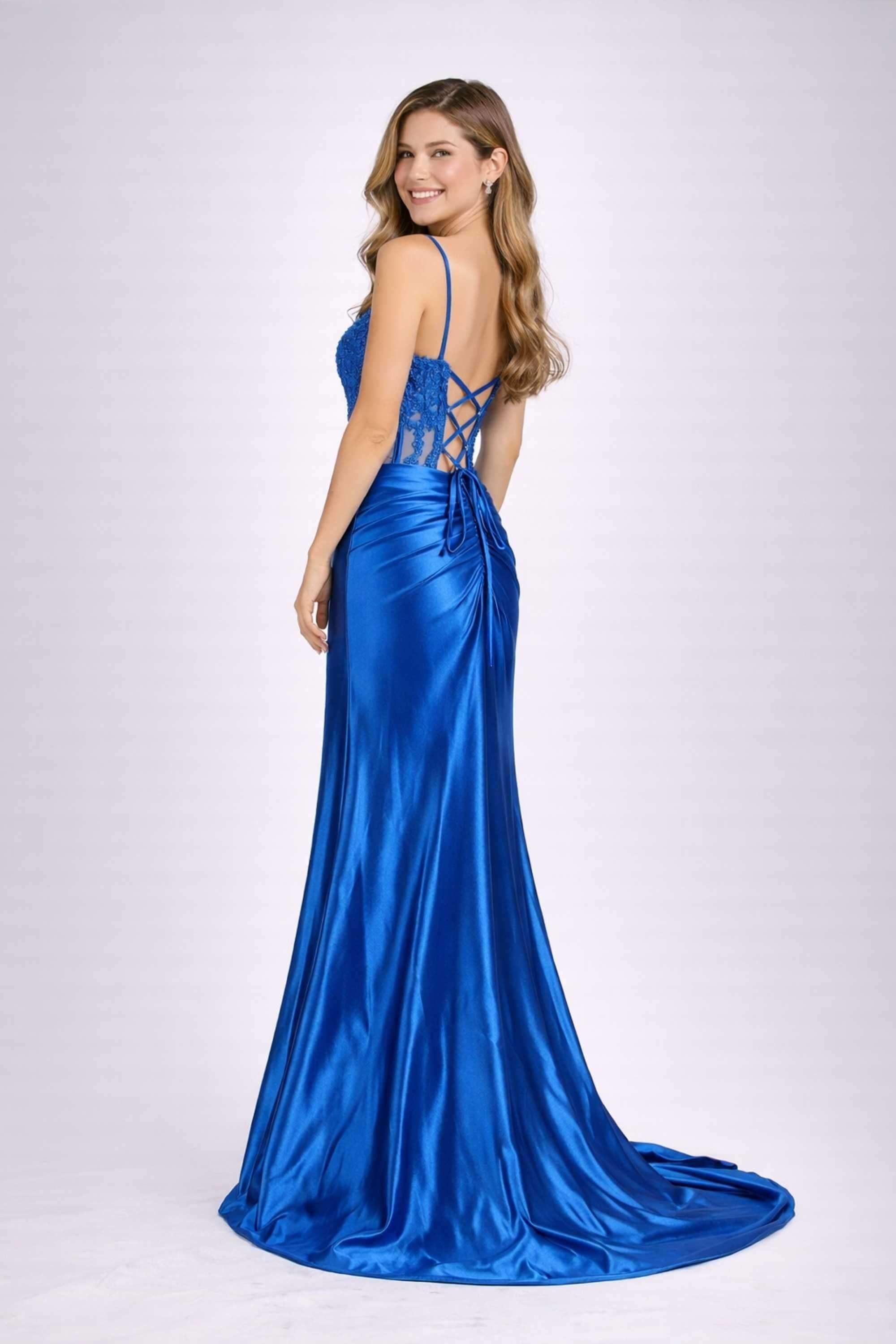Faites sensation dans cette robe de bal corset en satin bleu royal.