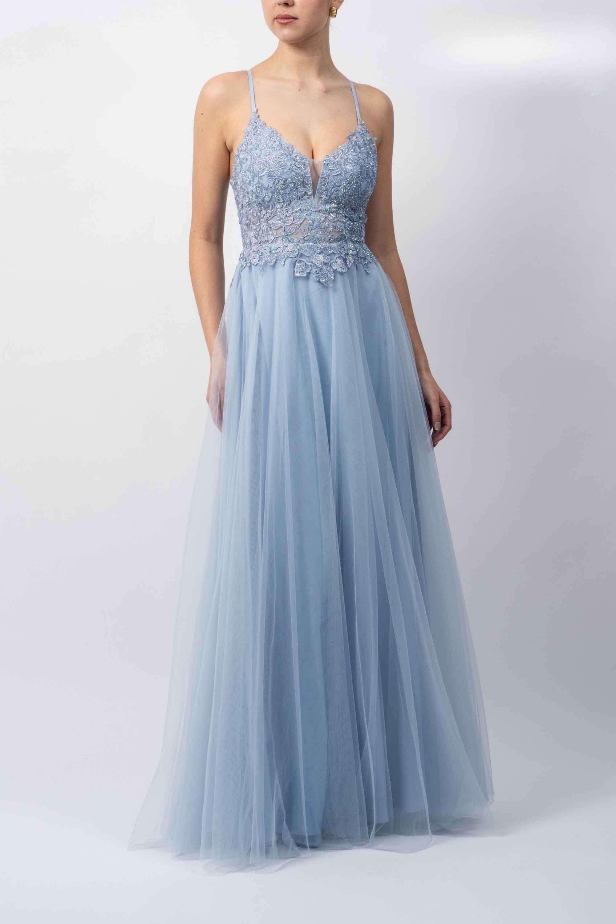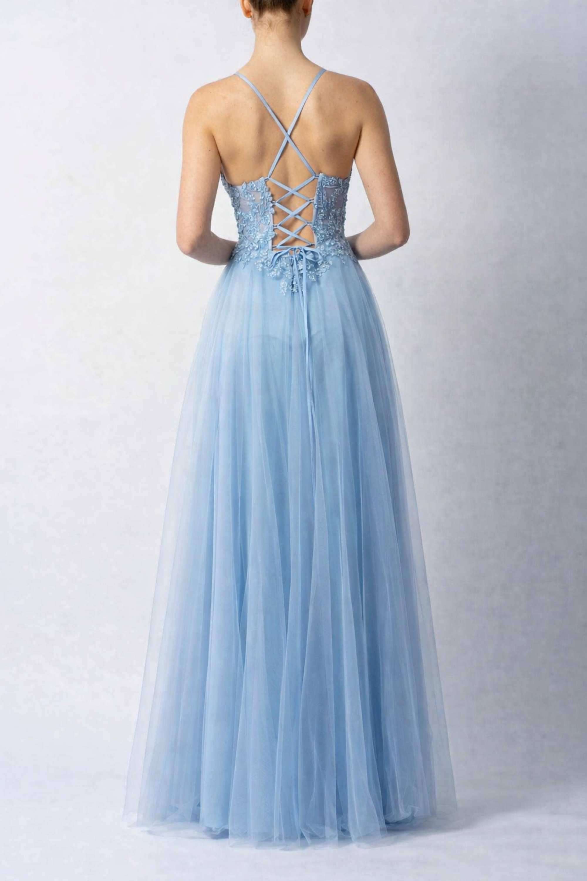 Associez cette robe de bal en tulle bleu ciel à des accessoires argentés ou en cristal et à des talons souples pour un look de bal raffiné et élégant.