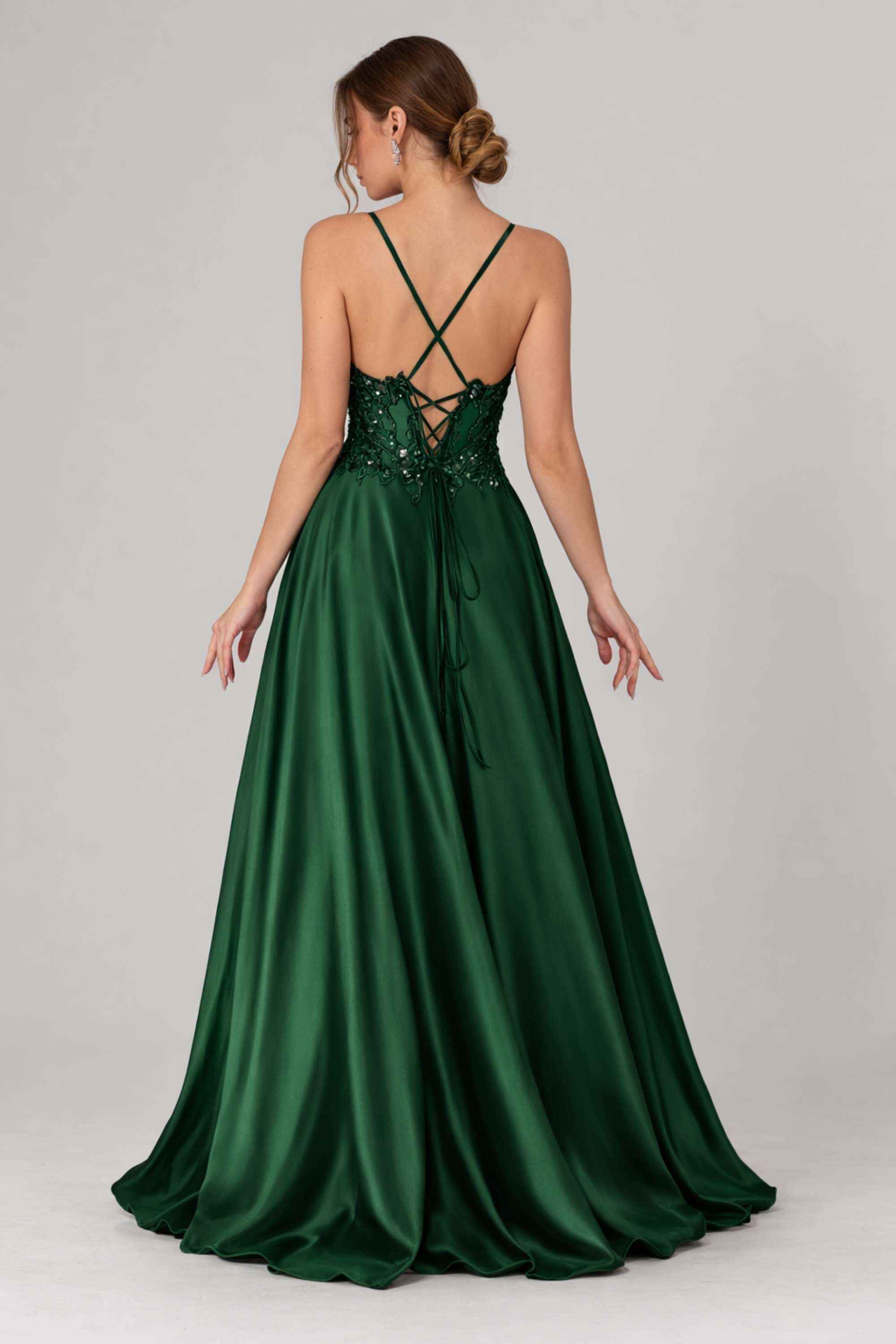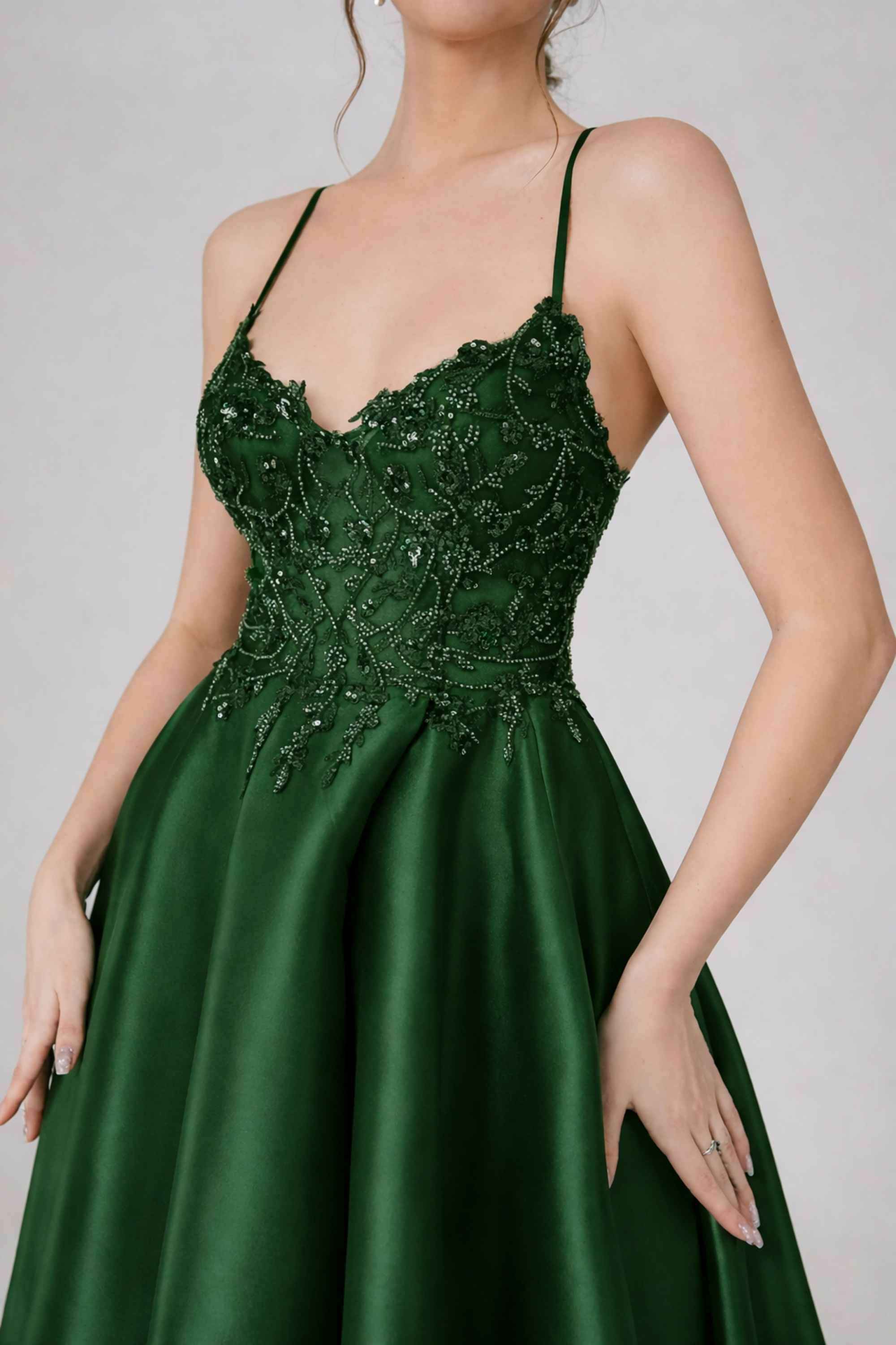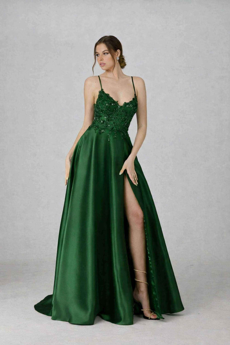 Cette robe présente une élégante jupe ample en taffetas qui ondule gracieusement à chaque pas, mise en valeur par une fente haute dévoilant subtilement la jambe pour une touche de séduction. Sa coupe évasée flatteuse sublime votre silhouette tout en vous assurant un confort optimal durant votre événement.