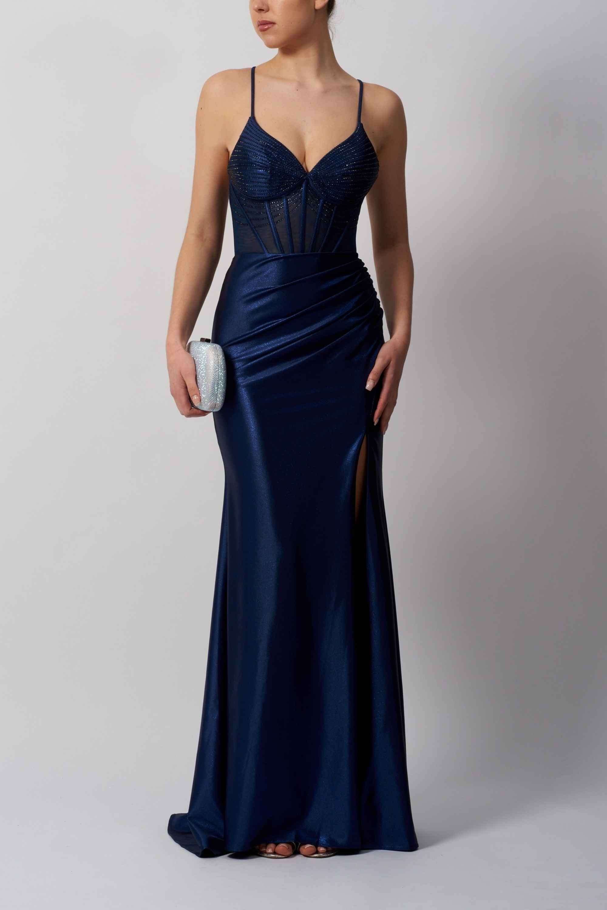 The beaded jersey gown is enhanced with a corset-style lace-up back, offering both structure and adjustable comfort. A gentle drape through the skirt adds movement, making this navy beaded jersey gown perfect for proms, formal evenings, and black-tie occasions. Confident, glamorous, and refined, this design ensures you stand out with effortless elegance.