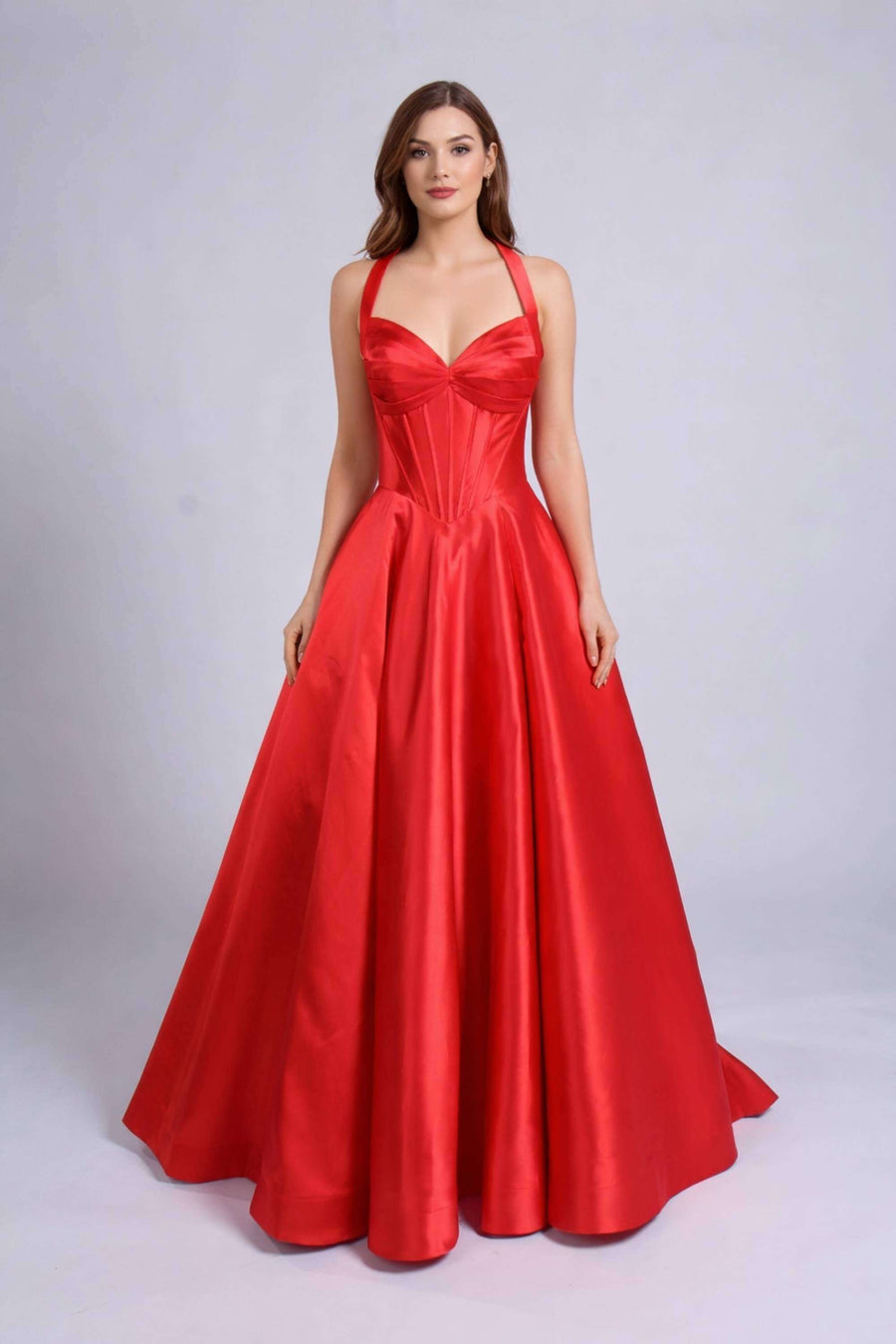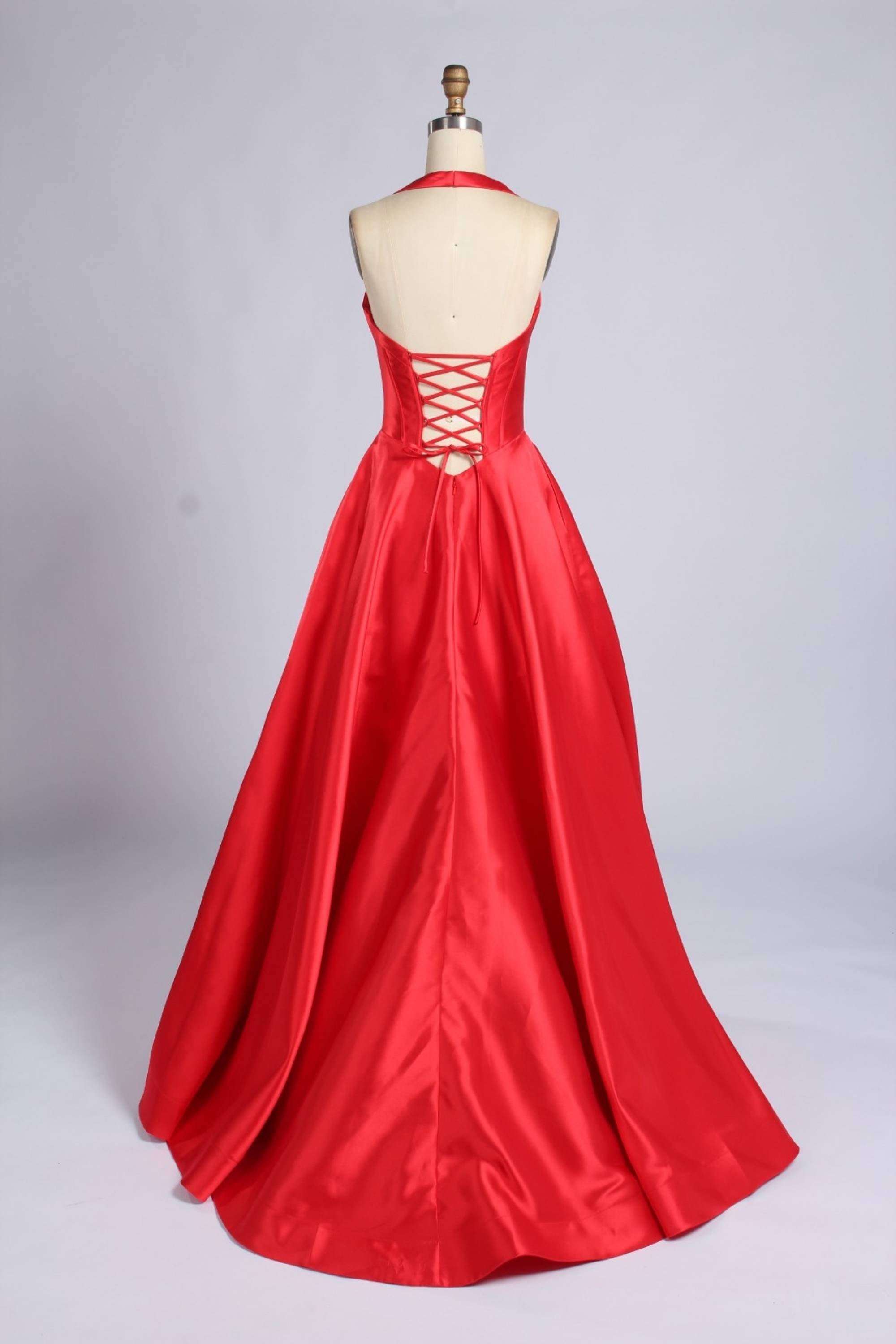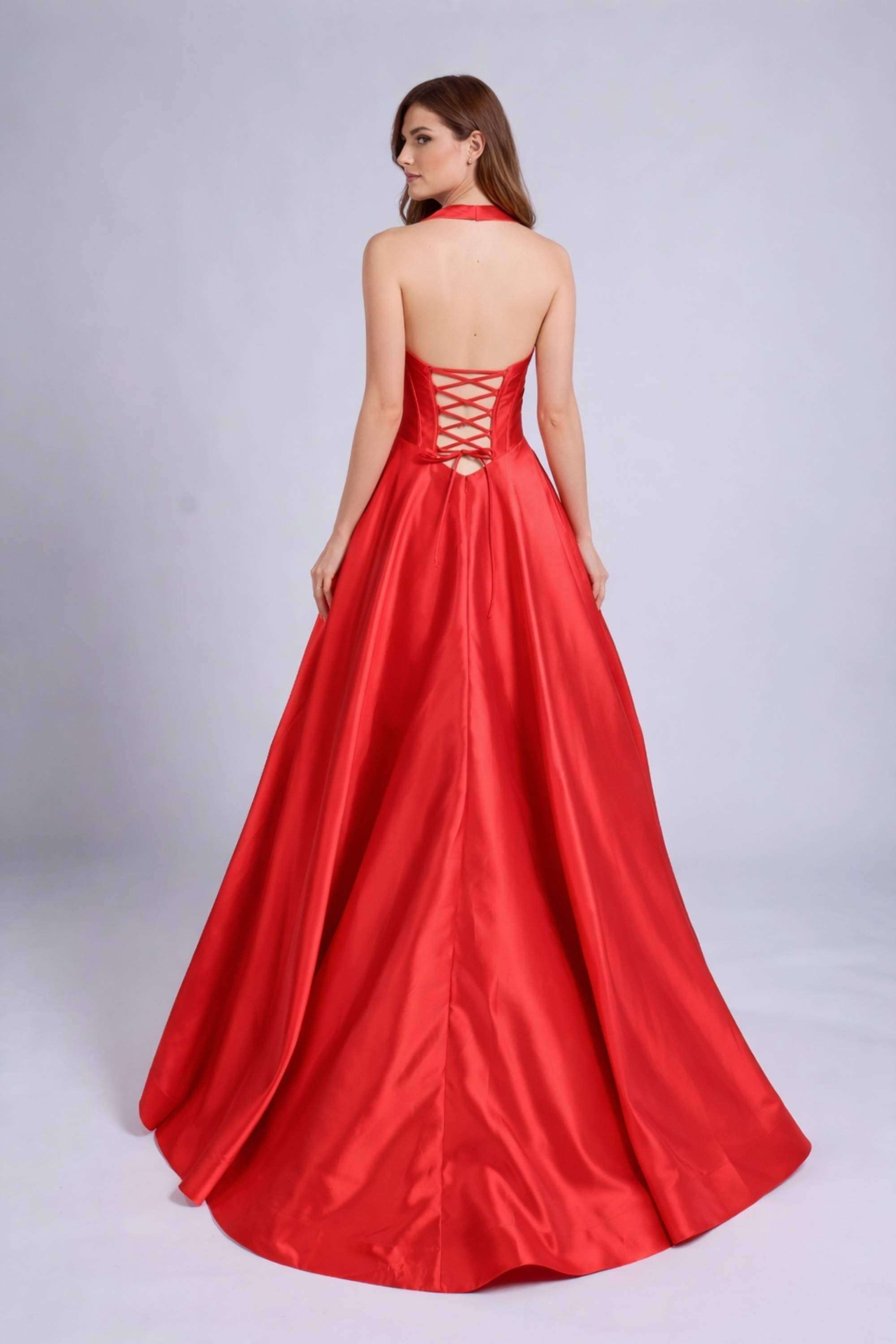 Designed for girls who want a true statement piece, this Red Mikado Prom Ballgown features a full ballgown skirt that creates elegant volume and movement. The halter-style neckline adds a modern touch, while the lace-up back detail allows for an adjustable fit that enhances comfort and confidence. The rich red colour adds strong impact, making it ideal for prom night, formal occasions, and special celebrations.