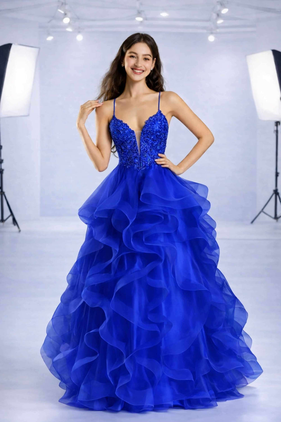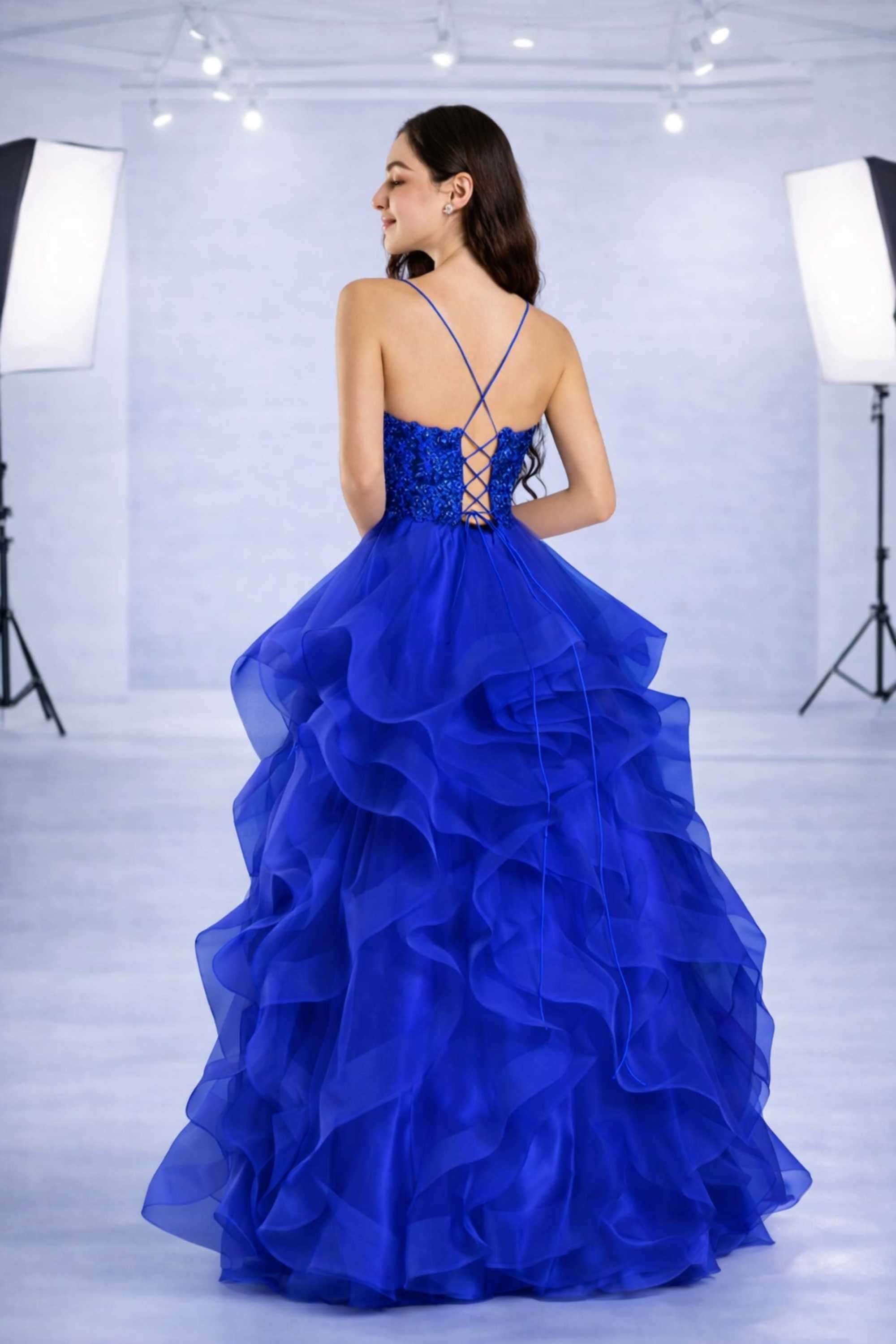 This Royal Blue Tulle Ballgown has a full ruffled skirt, which is the true masterpiece of this design — cascading layers of royal blue tulle create volume, movement, and a dreamy fairy tale effect from every angle. Each tier floats effortlessly as you walk or dance, making this gown a perfect choice for proms, pageants, evening galas, or any special event where you want the spotlight to follow you.