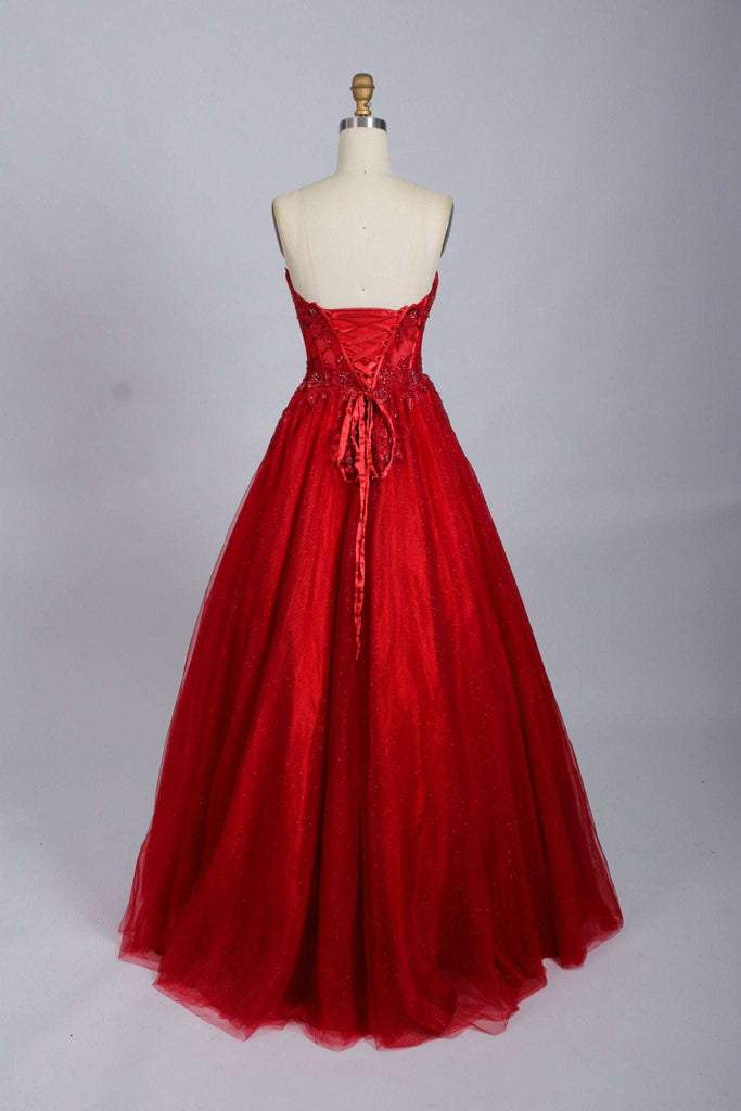The intricate lace-up back allows for customizable support, while the sweetheart neckline adds a touch of romance. Its glitter tulle full skirt, complete with a tulle underskirt, creates a dreamy, voluminous effect that floats with every step. Please note: the rich, sophisticated hue is a deep Wine, not red—perfect for making a statement.