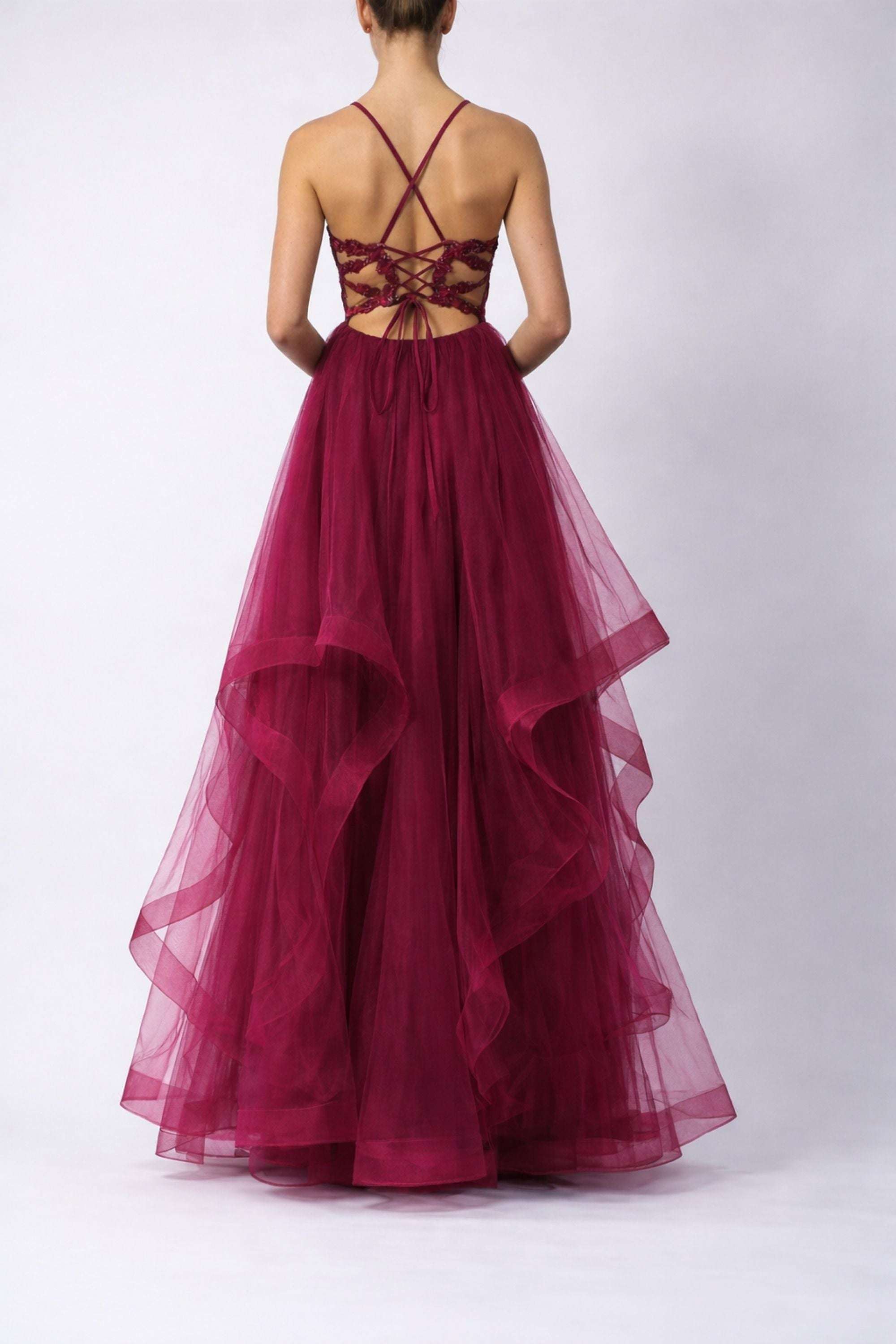 The cross-back lace-up detail adds a striking finish while allowing for an adjustable and flattering fit. Lightweight tulle enhances the flow of the skirt, ensuring comfort throughout the night. Refined yet eye-catching, Cross Back Tulle Berry Ballgown is ideal for those who love timeless glamour with a modern, fairy tale-inspired silhouette.