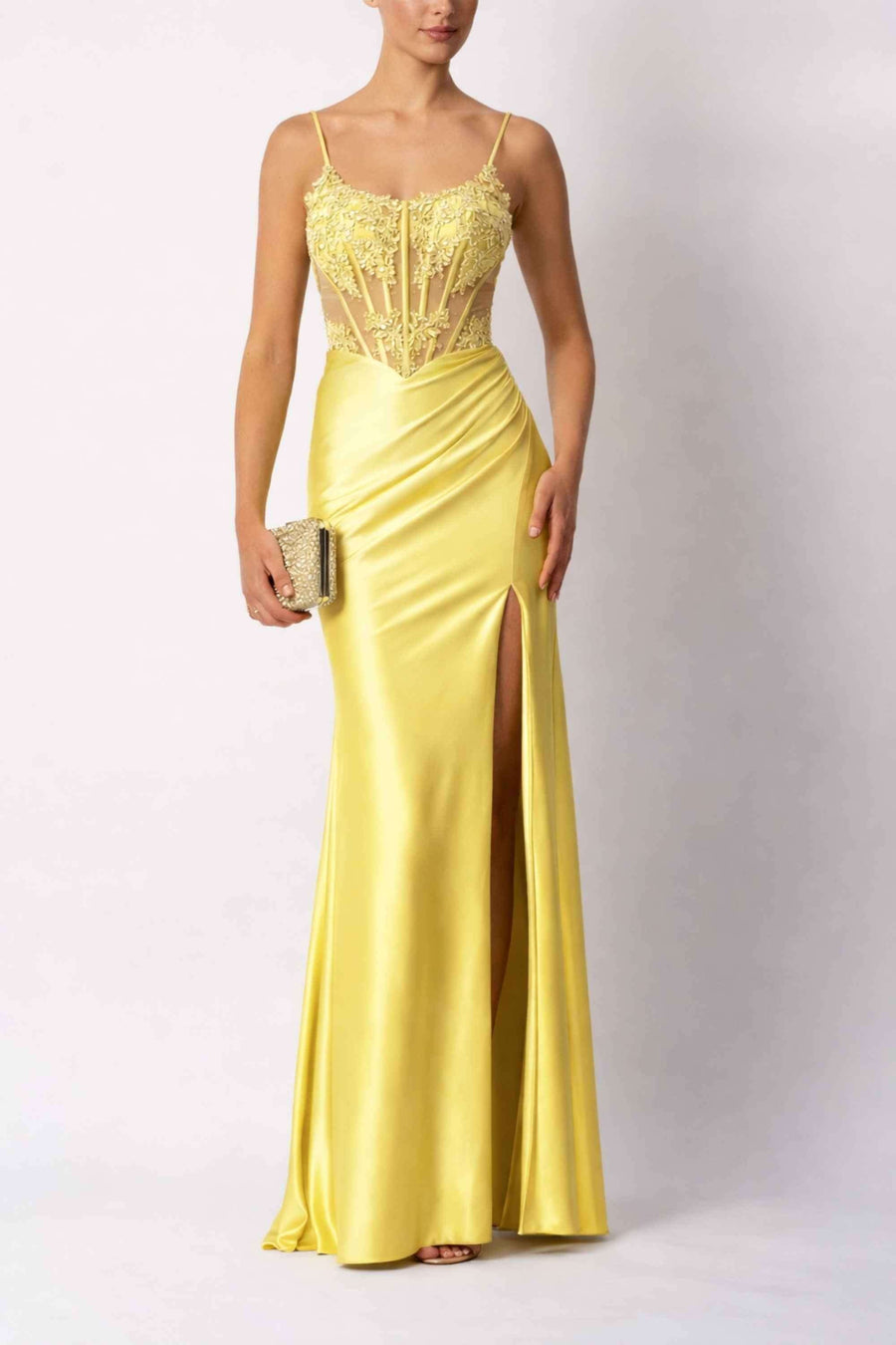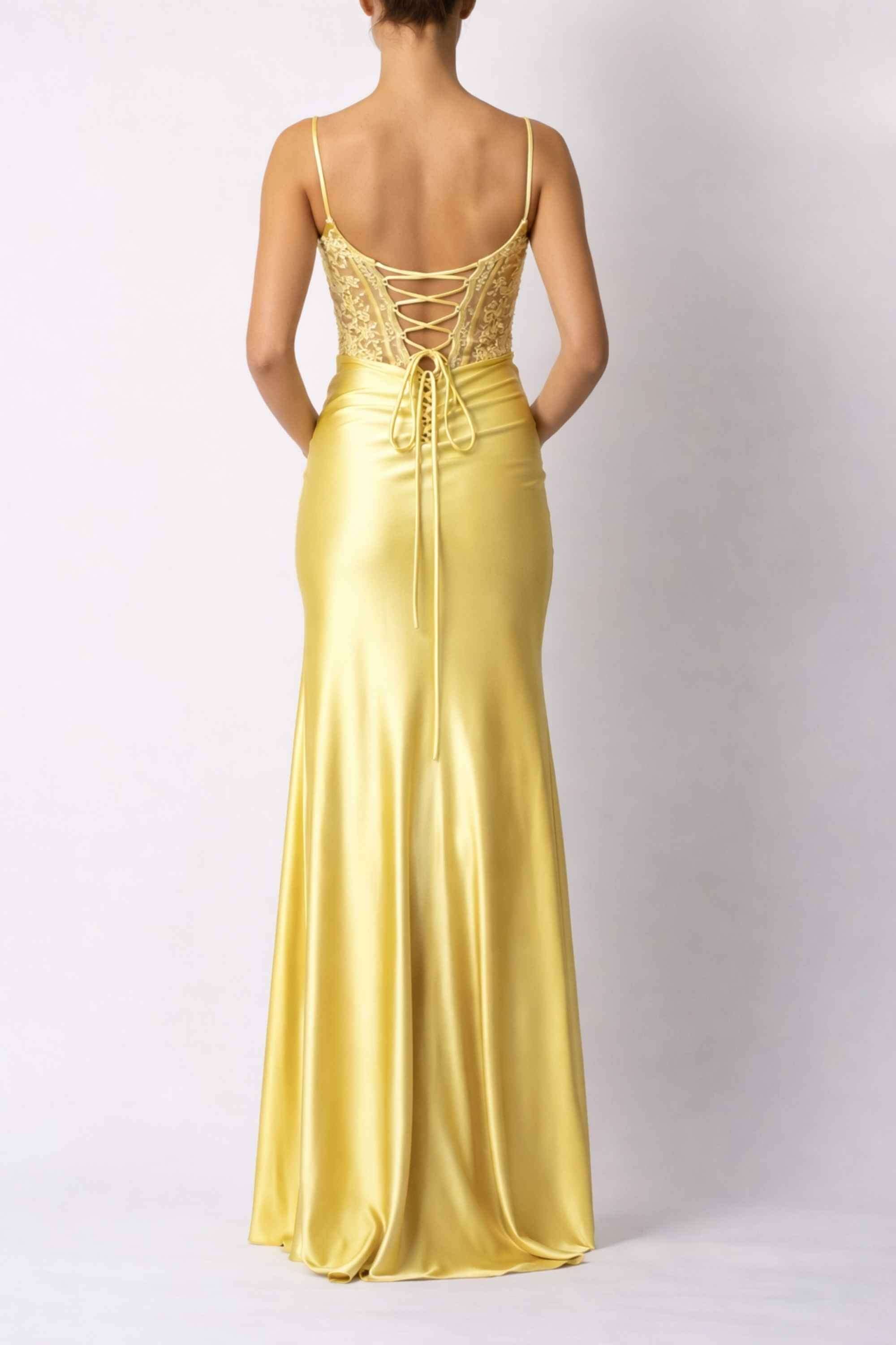 The Lemon Fitted Bead Jersey Prom Dress features a structured, illusion bodice adorned with intricate beadwork and delicate lace detailing, creating a refined corset-inspired look. Slim spaghetti straps and a lace-up back ensure a secure, adjustable fit, while the smooth skirt flows into a dramatic floor-length hem with a daring thigh-high split for added movement and allure.