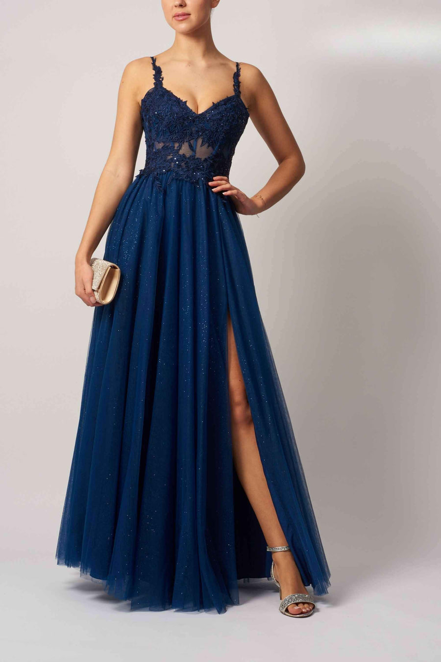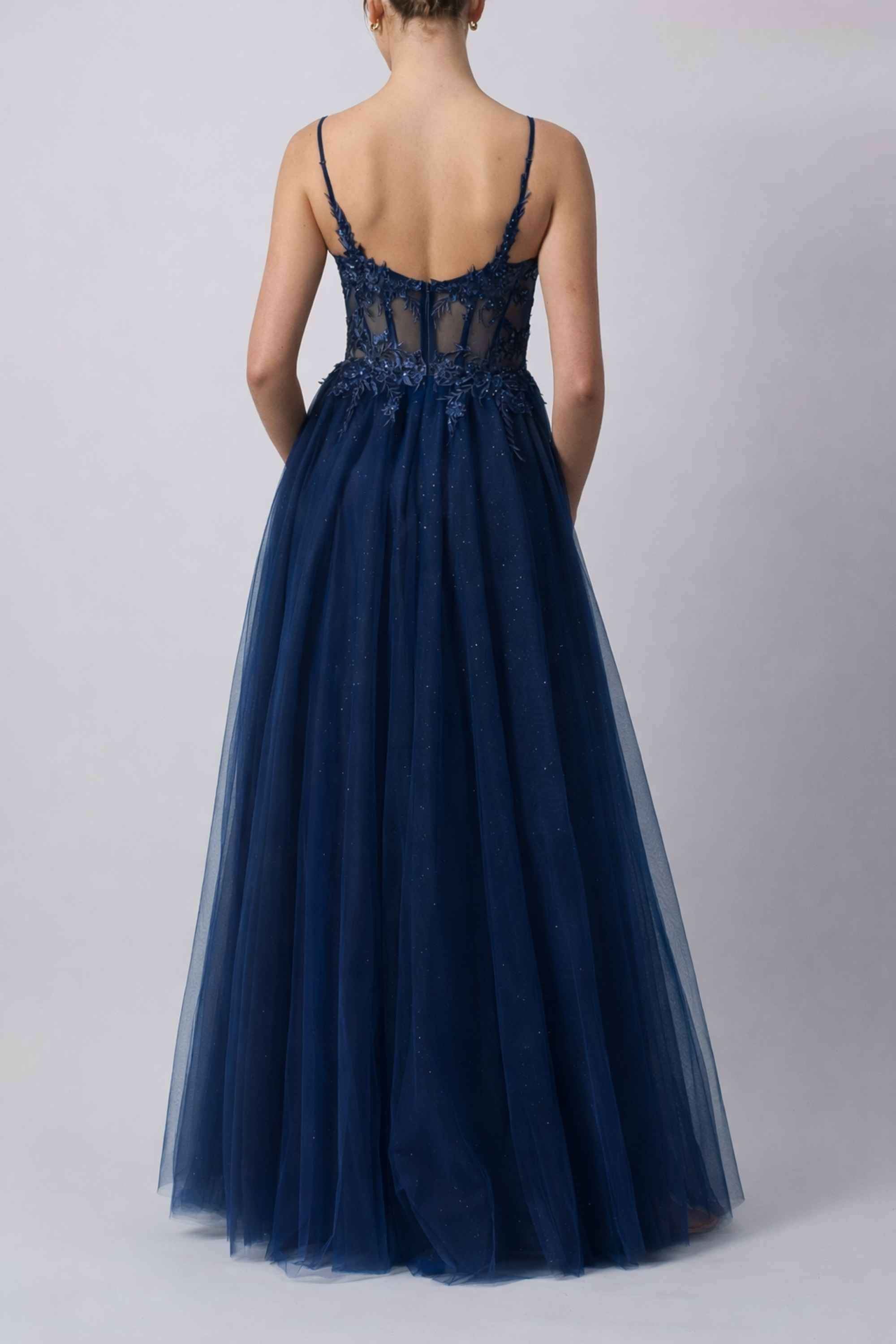 Ideal for customers seeking beautiful affordable gowns, this style delivers a luxury feel without the luxury price. Comfortable, elegant, and easy to style, it transitions seamlessly across a range of occasions. With its flowing silhouette and detailed bodice, the Navy Tulle Dress is a dependable option for elegant evening & prom wear.
