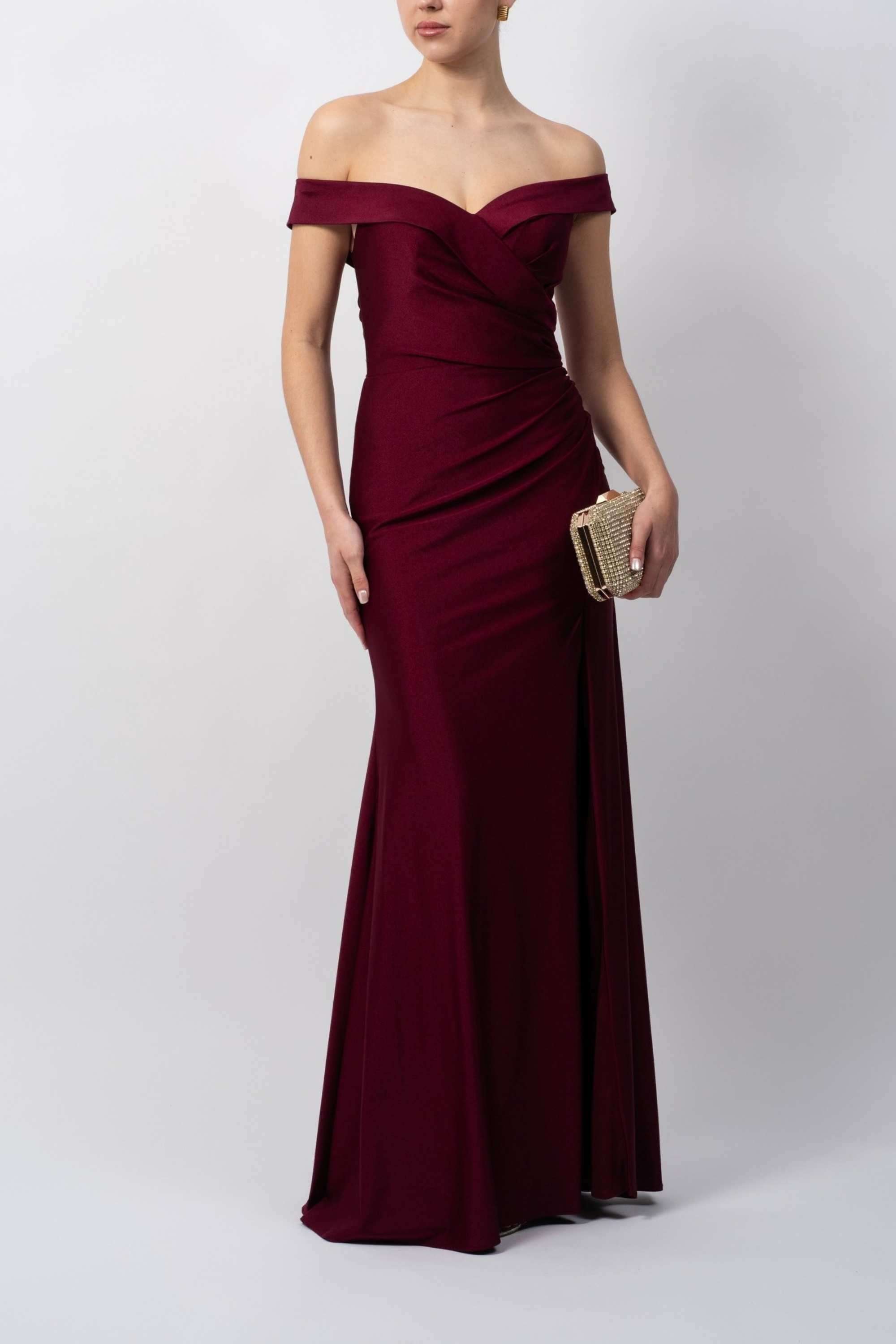 Designed with gentle ruching through the bodice, this gown helps shape and flatter the waist without feeling restrictive. The jersey fabric drapes beautifully, flowing into a floor-length skirt that gives the Wine Bardot Fall Jersey Dress a sleek and timeless silhouette. A concealed back zip ensures a secure fit while keeping the overall finish smooth and polished.