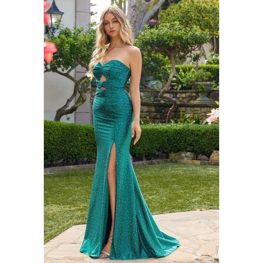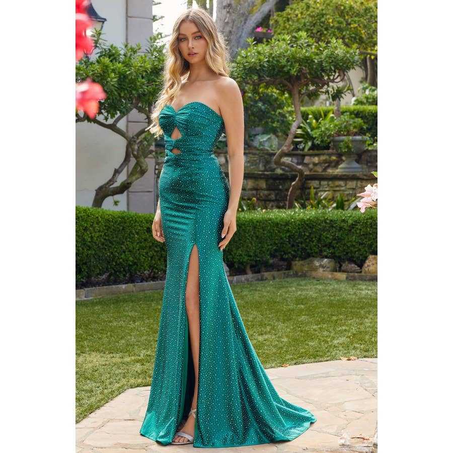 Step into elegance with our stunning fitted long formal dresses, featuring a luxurious satin design in vibrant emerald green. This gorgeous strapless gown is perfect for any black tie gala or special occasion.