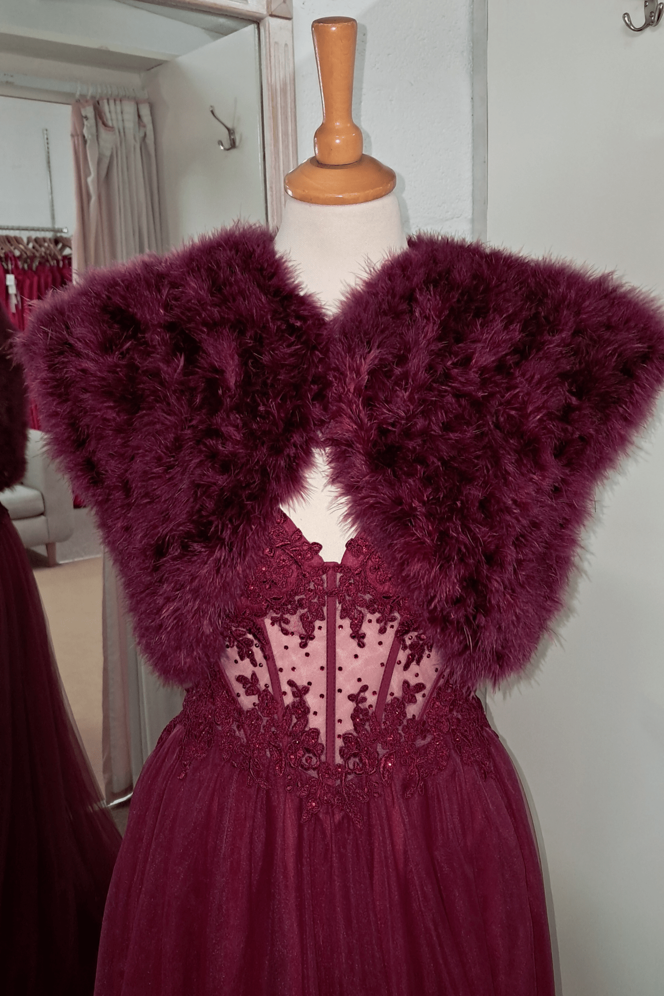 Make a stunning statement at any special occasion with our exquisite Feather Ladies Shrug in a rich wine hue. Crafted with genuine feathers and elegant capped sleeves, this bolero is the perfect finishing touch to complete your ensemble, whether you're attending a wedding, prom, or glamorous evening event.