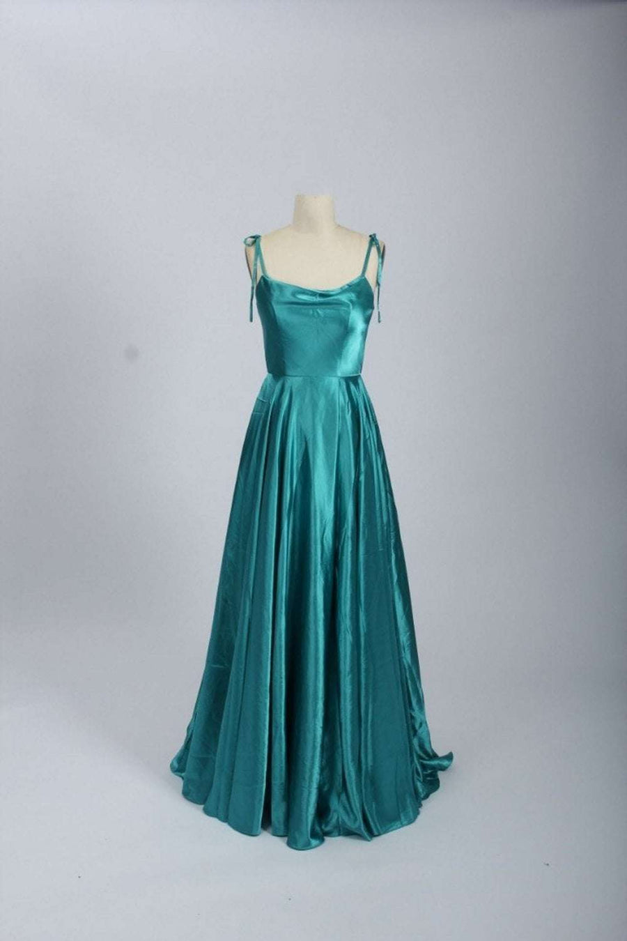 Make your grand entrance unforgettable - order your custom teal satin ballgown with pockets today and experience the perfect blend of luxury and practicality!